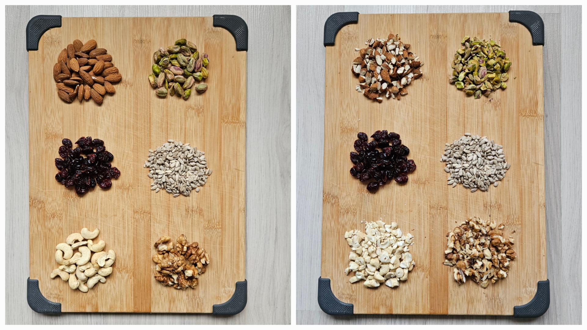 Ořechy nasekejte nožem na menší kousky, semínka a sušené ovoce ponechejte v celku.