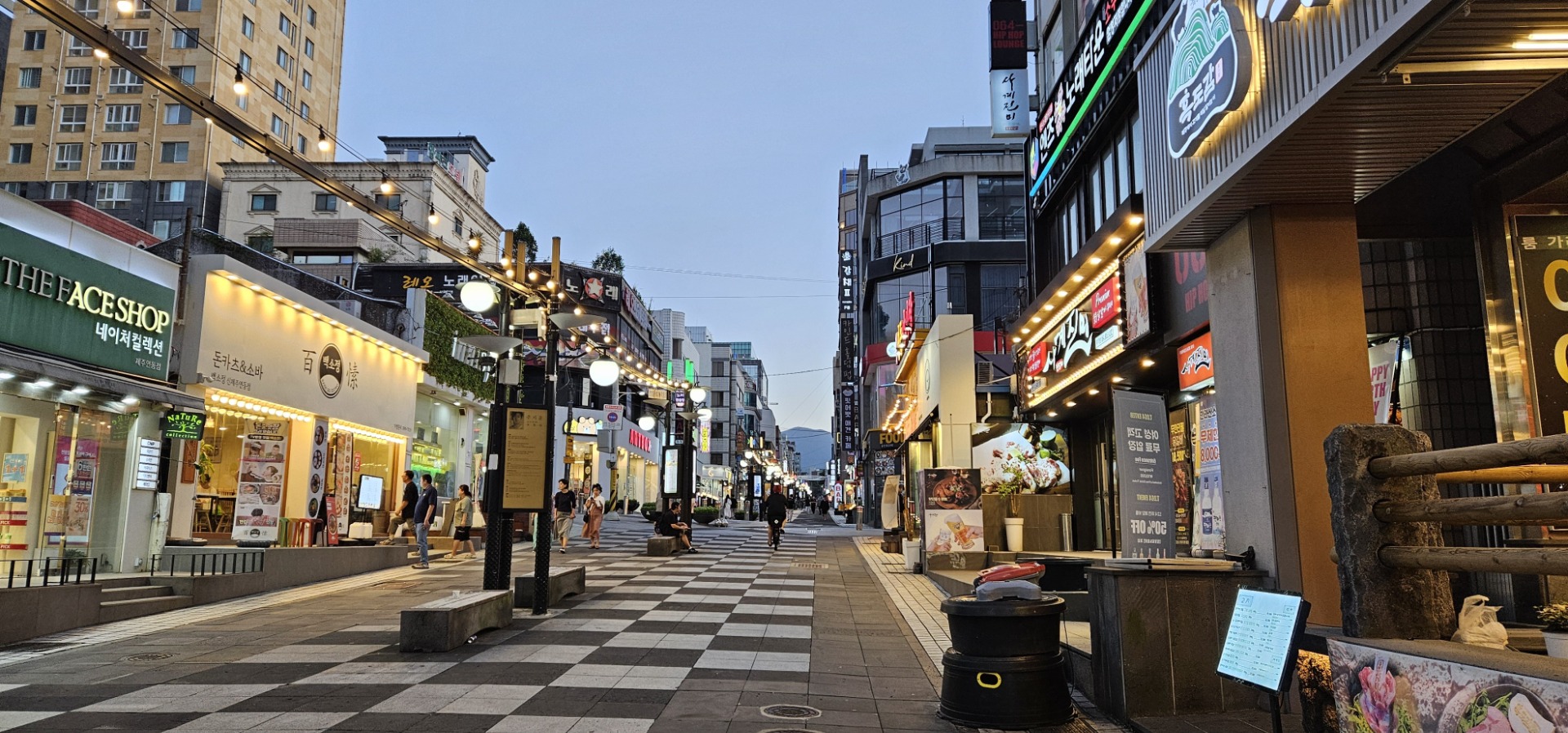 Vzhledem k mému stavu jsme večer nemohli zakončit tradičními hody v našem oblíbeném japonském bistru (vidíte ho na fotce níže vlevo vedle TheFaceShop), bez odměny za přežití jsme však nezůstali. Vidíte ten kopec vzadu na horizontu? To je Hallasan. Tak se nám po několika dnech strávených za hradbou z dešťových mračen konečně ukázal, kluk jeden usoptěná. Možná ho ještě někdy zdoláme.