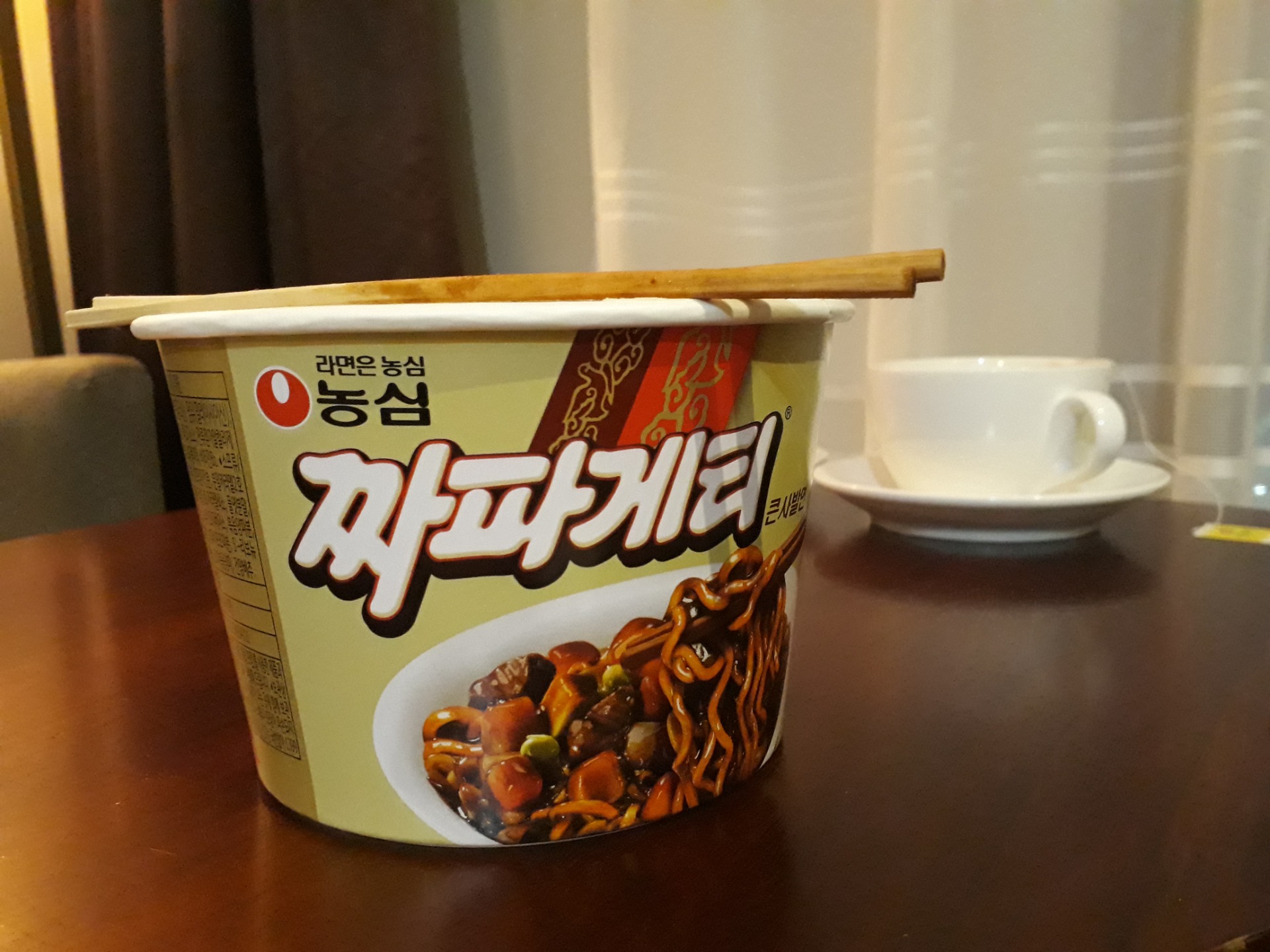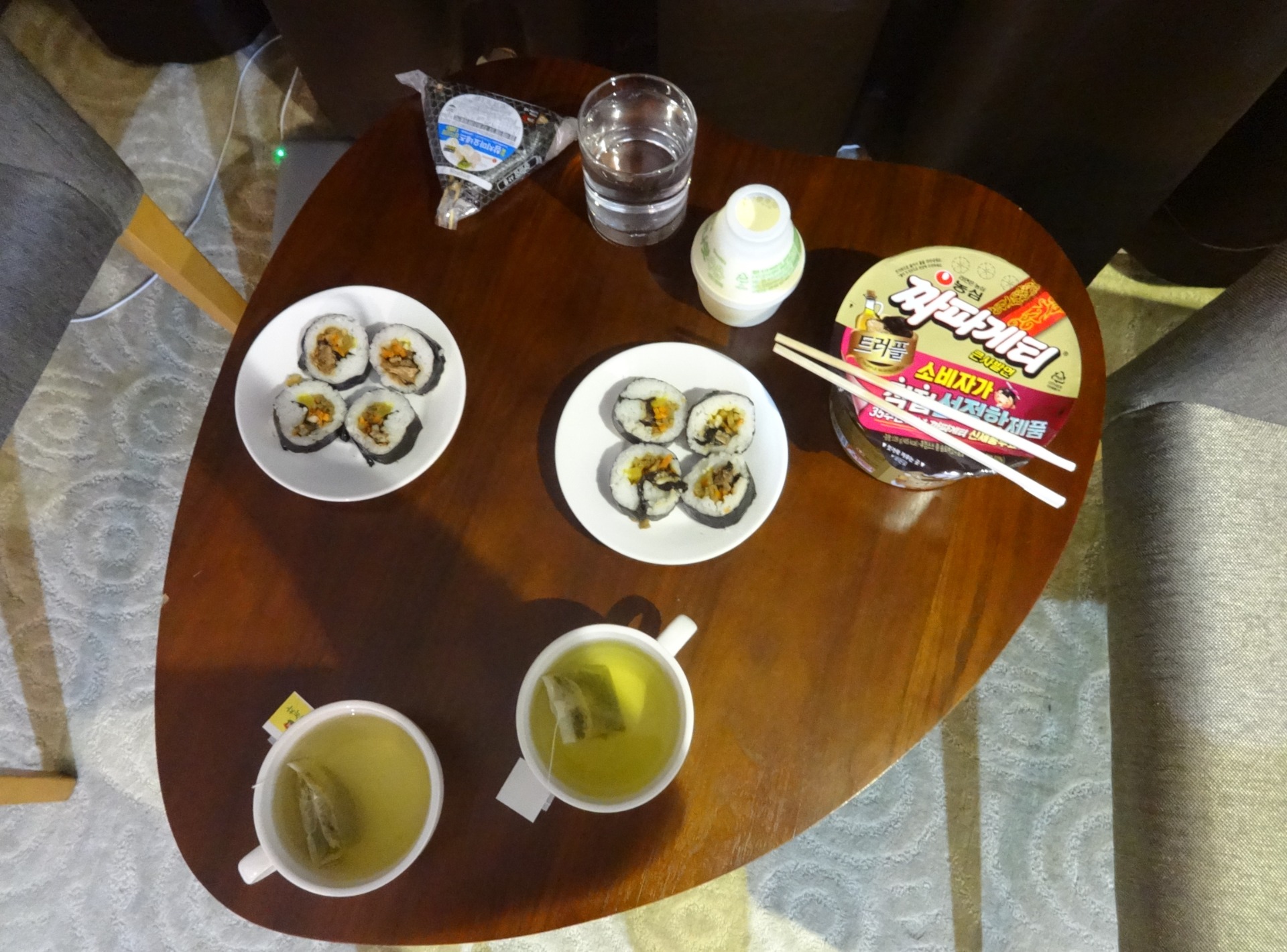 Na fotce si ještě všimněte malé plastové lahvičky s banánovým mlékem (vynikající sladké občerstvení) a čaje dole. Na každém hotelovém pokoji v Jižní Koreji, kde jsme byli ubytováni, nám tento čaj z hnědé rýže pravidelně doplňovali. Nic podobného jsme nikdy nepili a musím říct, že chutná opravdu nezvykle (nikomu dalšímu, koho známe, moc nejede), ale my jsme si na něj tak zvykli, že ho pravidelně kupujeme v korejských potravinách a vždy máme doma hojné zásoby.