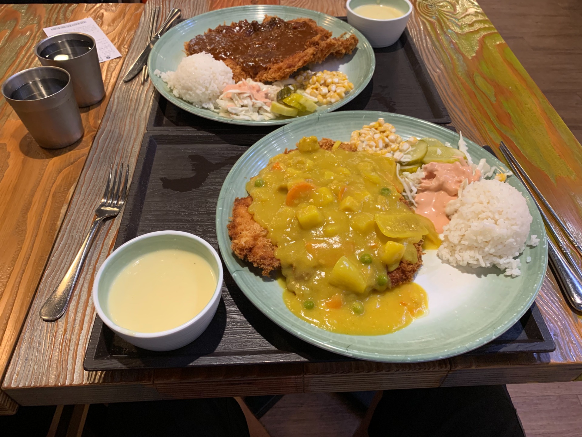 - na obrázku s řízky si všimněte dvou plechovek s vodou po levé straně, nejen v Jižní Koreji je standardně součástí objednaného jídla, obsluha vám ji většinou nalije po vašem usazení a podle potřeby dolévá, případně máte na stole/někde poblíž džbán