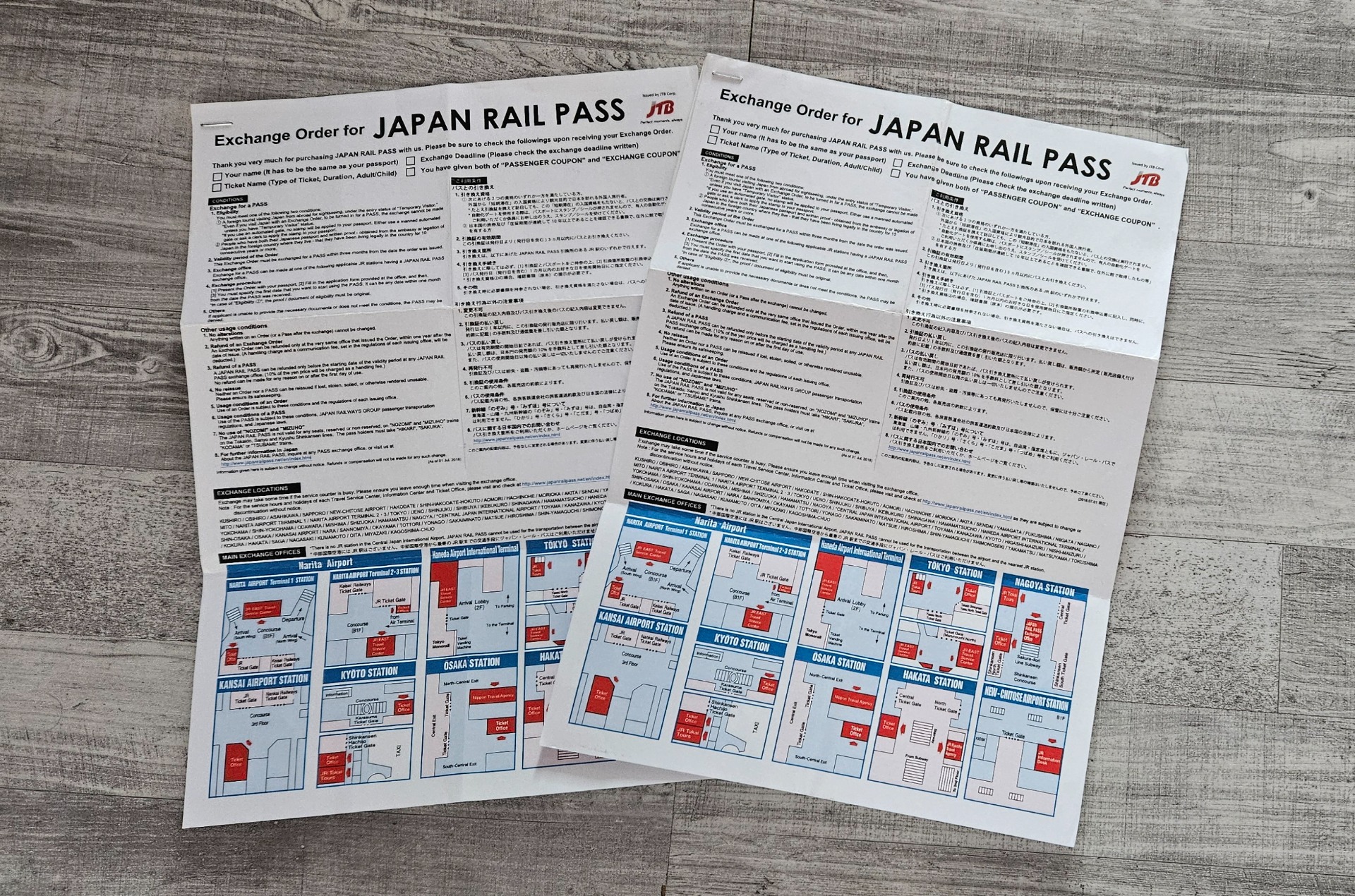 JR Pass vyřídíte v autorizovaných pobočkách, vybraných cestovních kancelářích nebo online. Čím dříve, tím lépe, jelikož jde o administrativní úkon a pár dní potrvá, než poštou přijde potvrzení. Platnost JR Passu je max. 90 dnů od data vystavení a lze zvolit variantu na 7, 14 nebo 21 dní. Z toho vychází cena, nikterak malá, ale pořád se to vyplatí. Po příletu JR Pass aktivujete na jedné z poboček – my jsme tak učinili hned na Narita Airport – a výměnou za doklad (fotka výše, ve spodní části A4 mapa umístění poboček) dostanete váš jedinečný, nepřenosný JR Pass (fotka níže). Slouží k prokazování kontrolám, např. u hlídaných turniketů v metru, řidičům v autobusech atd.
