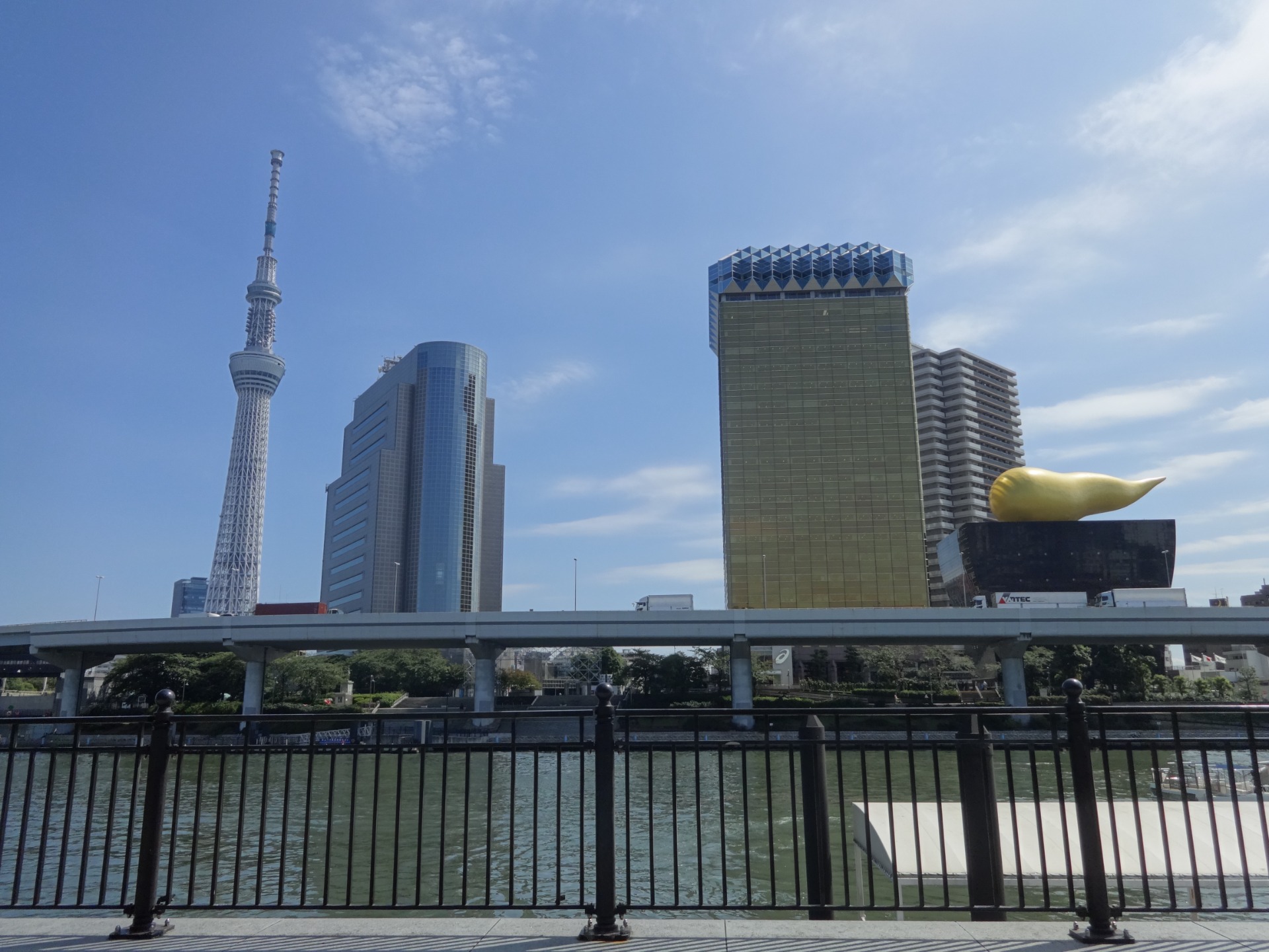 A to architektonické uskupení s podivným žlutým útvarem napravo je Asahi Group Head Office Building (ředitelství Asahi, největšího výrobce piva v Japonsku). Zlatá hranatá budova má připomínat sklenici naplněnou pivem s pěnou nahoře a zlatý plamen je symbolem planoucího srdce Asahi.