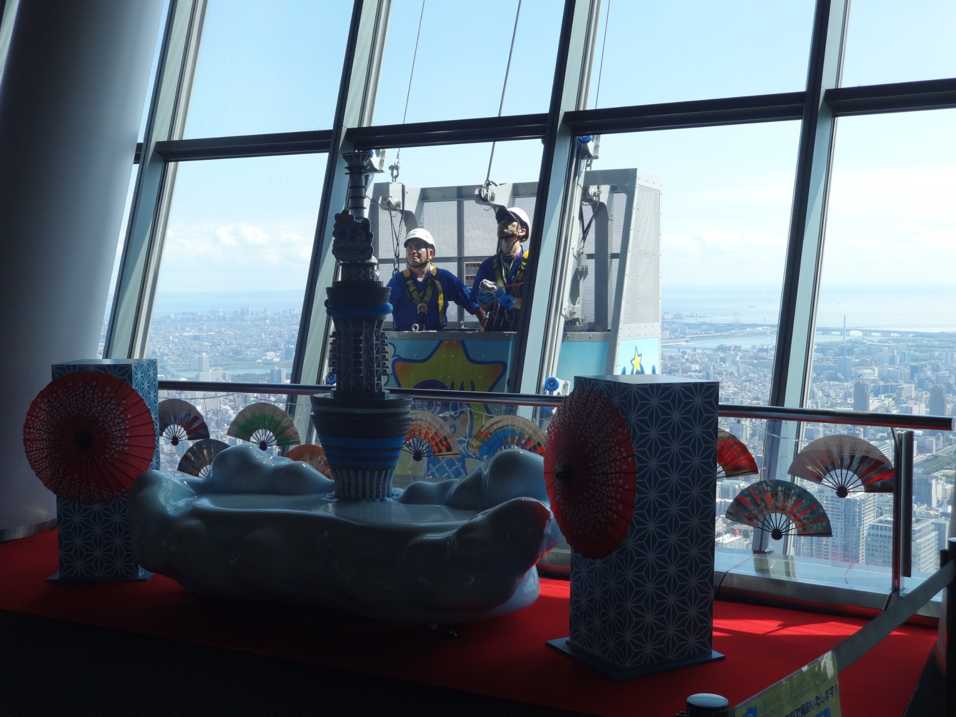 Další dnešní zastávkou byl Skytree, tokijská telekomunikační věž a nejvyšší stavba celého Japonska. Se svými 634m patří k desítce nejvyšších staveb světa. Pokud si vyjedete informace z Googlu, zjistíte, že se rozlišují "nejvyšší budovy světa", které NEzahrnují věže a vysílače, a "nejvyšší stavby světa", a tam je možné Skytree najít.
