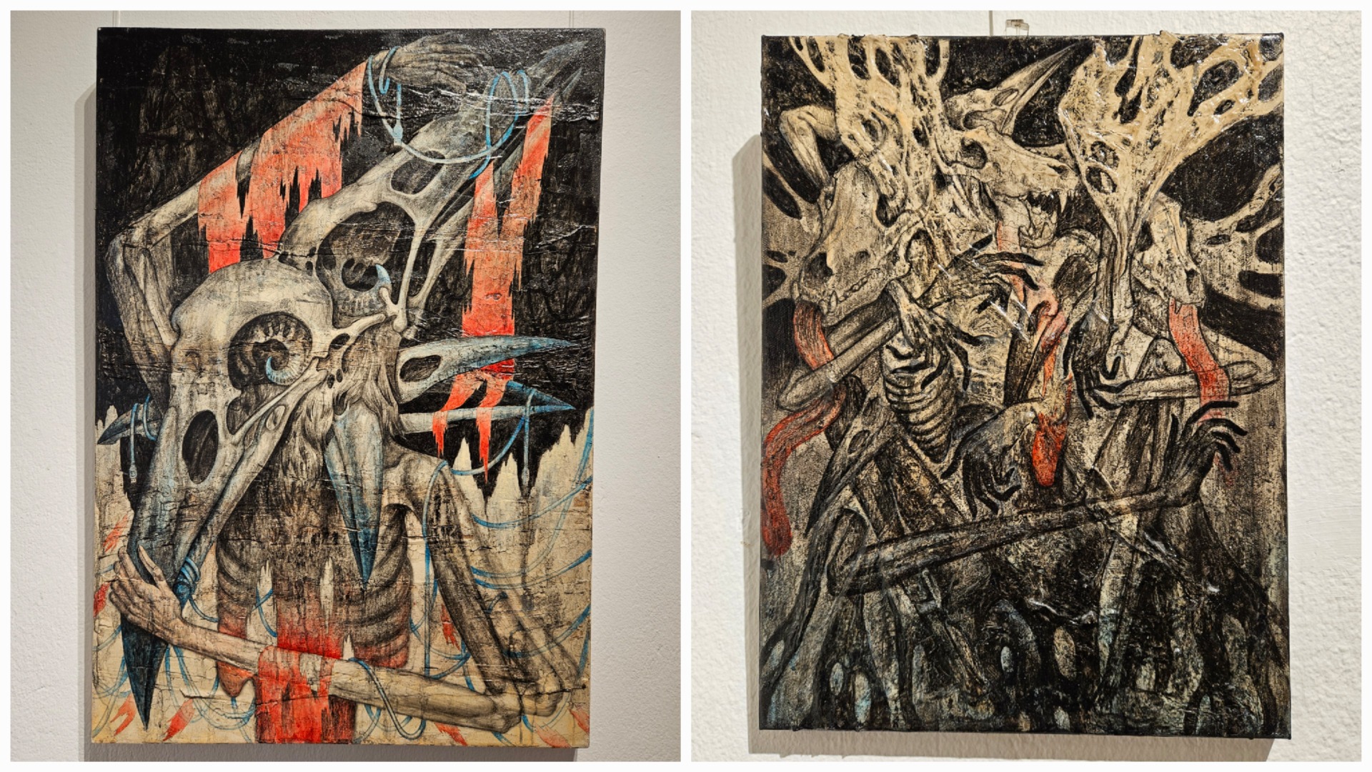 Zatímco horní patro nás vyděsilo přehlídkou provazů visících ze stropů a naaranžovaných sítí postříkaných (doufám) umělou krví, v přízemí jsme objevili podmanivé malby od Wutthiponga Sukthawila zobrazující buddhistickou kosmologii a úpadek lidského ducha vlivem moderních technologií. Své konceptuální umění označil jako "Mixed Media".
