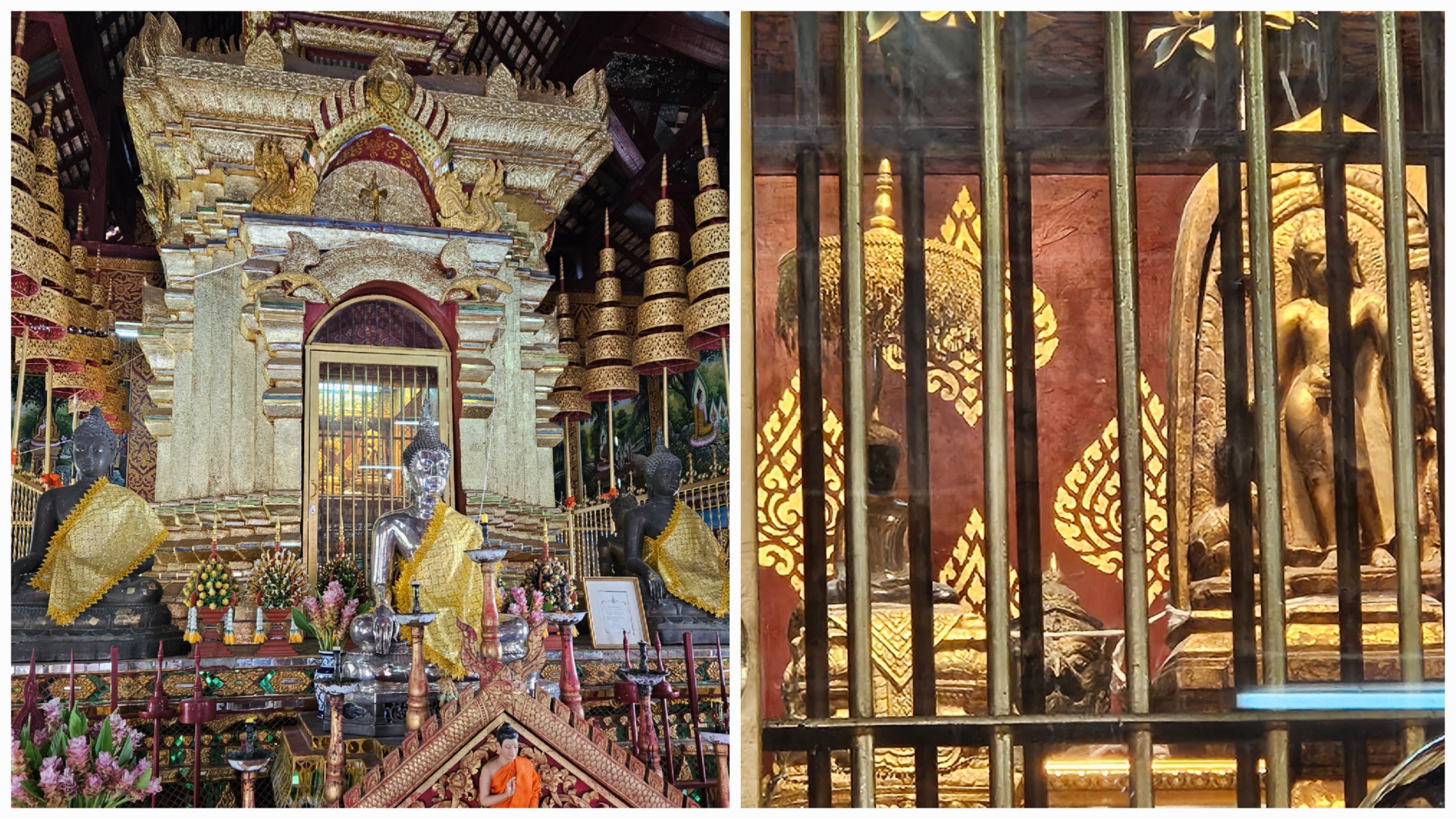 10ticentrimetrová soška Buddhy z krystalu vlevo je údajně stará 1800 let a ta dřevěná vedle ní prý dokonce 2500 let. Obě jsou ochrannými amulety uloženými v chrámu již od jeho založení, nicméně řada vědců se na základě podrobných zkoumání domnívá, že až tak staré nejsou. Někteří jim hádají sotva 1000 let. Pro mě za mě, ať je jim klidně jen tisíc, i tak jsou stále úctyhodnými pamětníky.