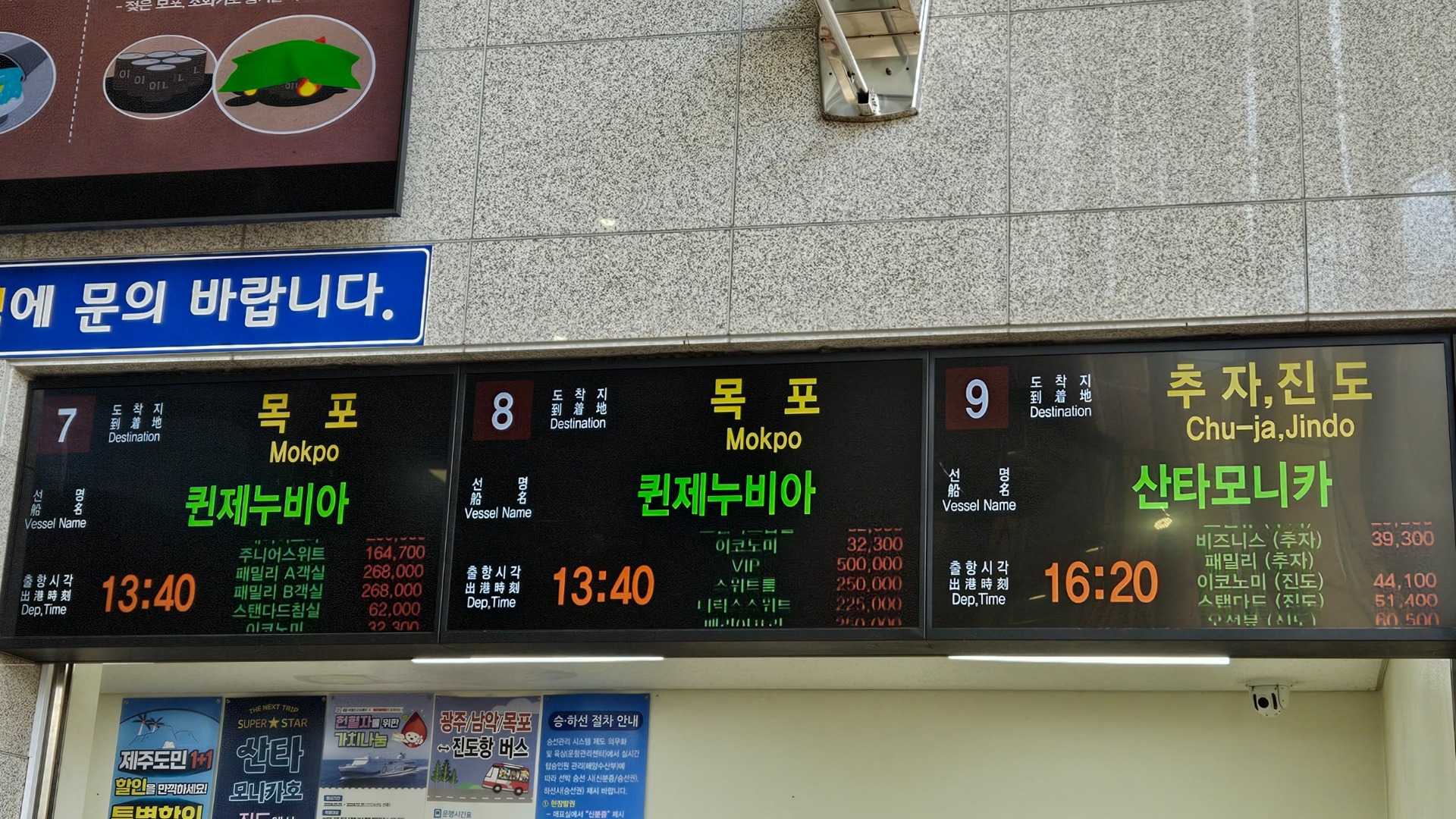 Naše loď je na prostřední tabuli (č.8 / Mokpo), odjezd 13:40, ceny vpravo dole pod sebou červeně (Economy, VIP, 2 typy apartmánů a pokoj s bezbariérovým přístupem). Za Economy class jsme zaplatili v přepočtu kolem 600 korun, zatímco pokoj nejvyšší kategorie vycházel přes 10 000,-Kč … 4 a půl hodiny cesty za desítku, kdo by to nechtěl… 😀