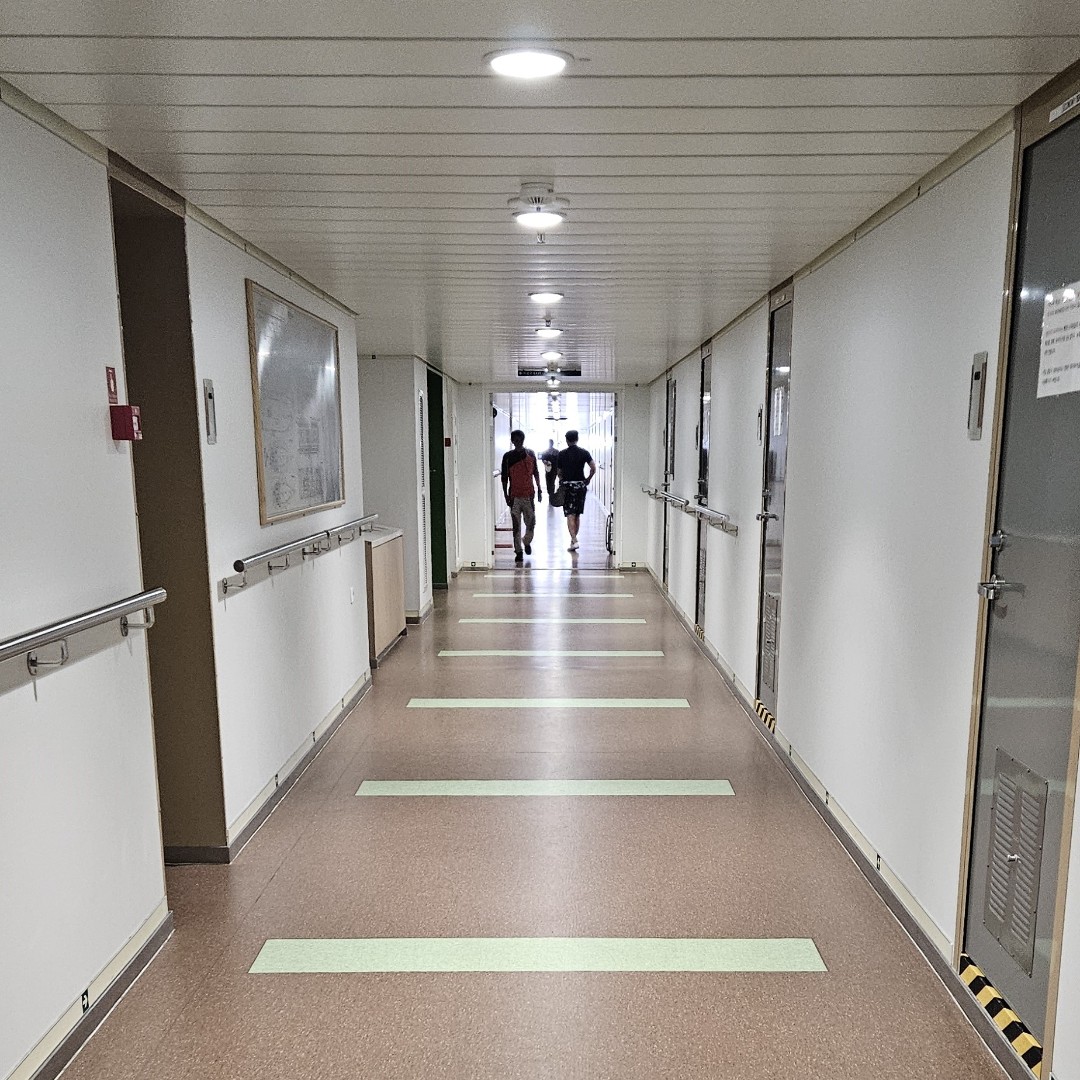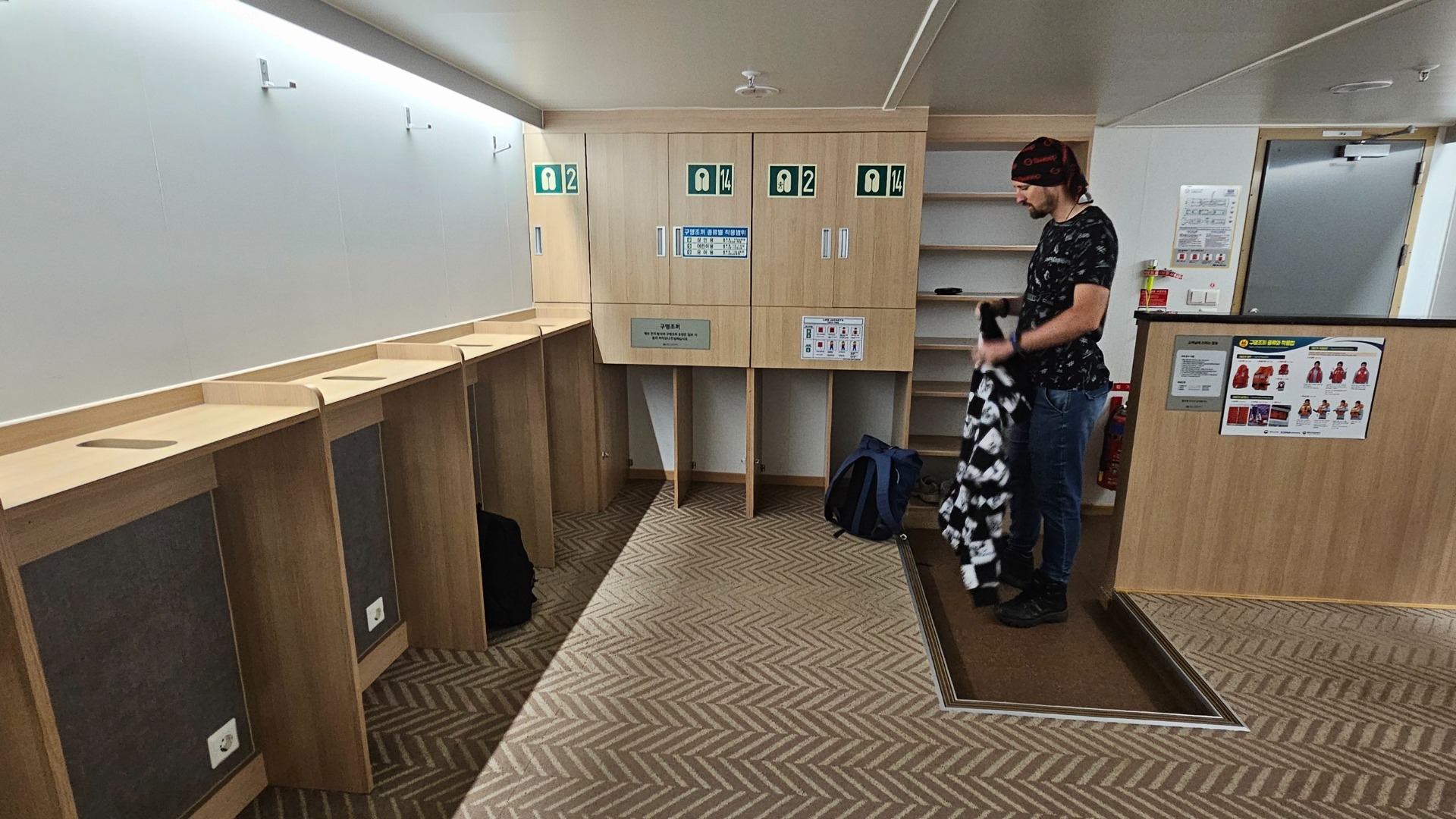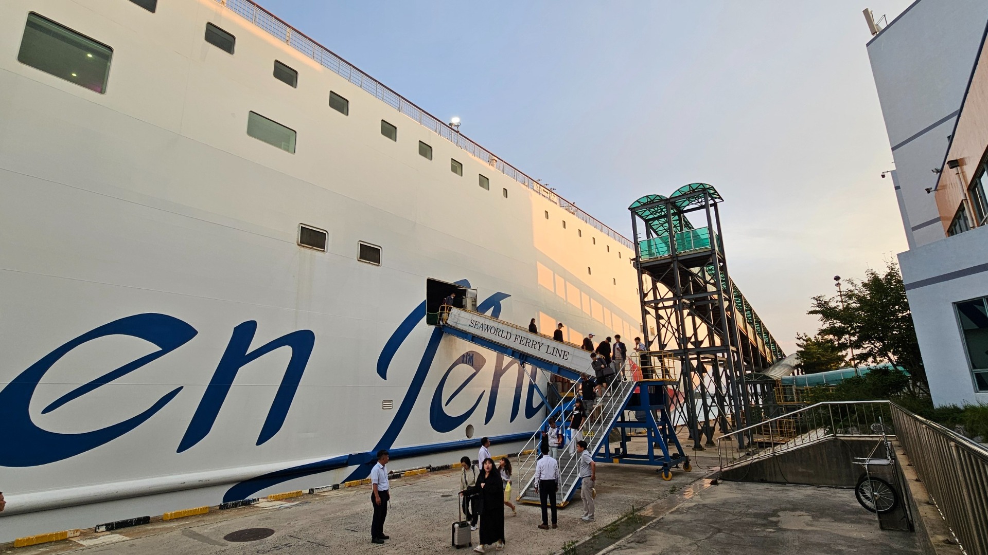 Hodinu před vyplutím otevřeli boarding a lidé vytvořili dvouřad ke kontrole -> Korejci vs. cizinci… Naše řada o třech lidech sestávala z vy víte jakých dvou osob a Korejce s americkým pasem. Po kontrole lístků a pasů jsme nastoupili do autobusu, následoval cca minutový převoz z k vysokému lodnímu můstku, jeho přechod, vstup dovnitř lodě a…