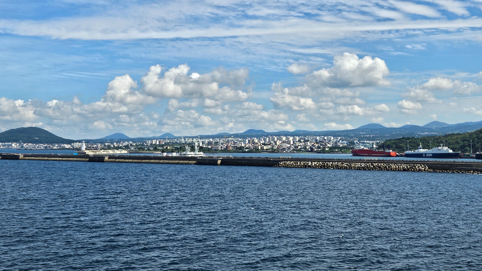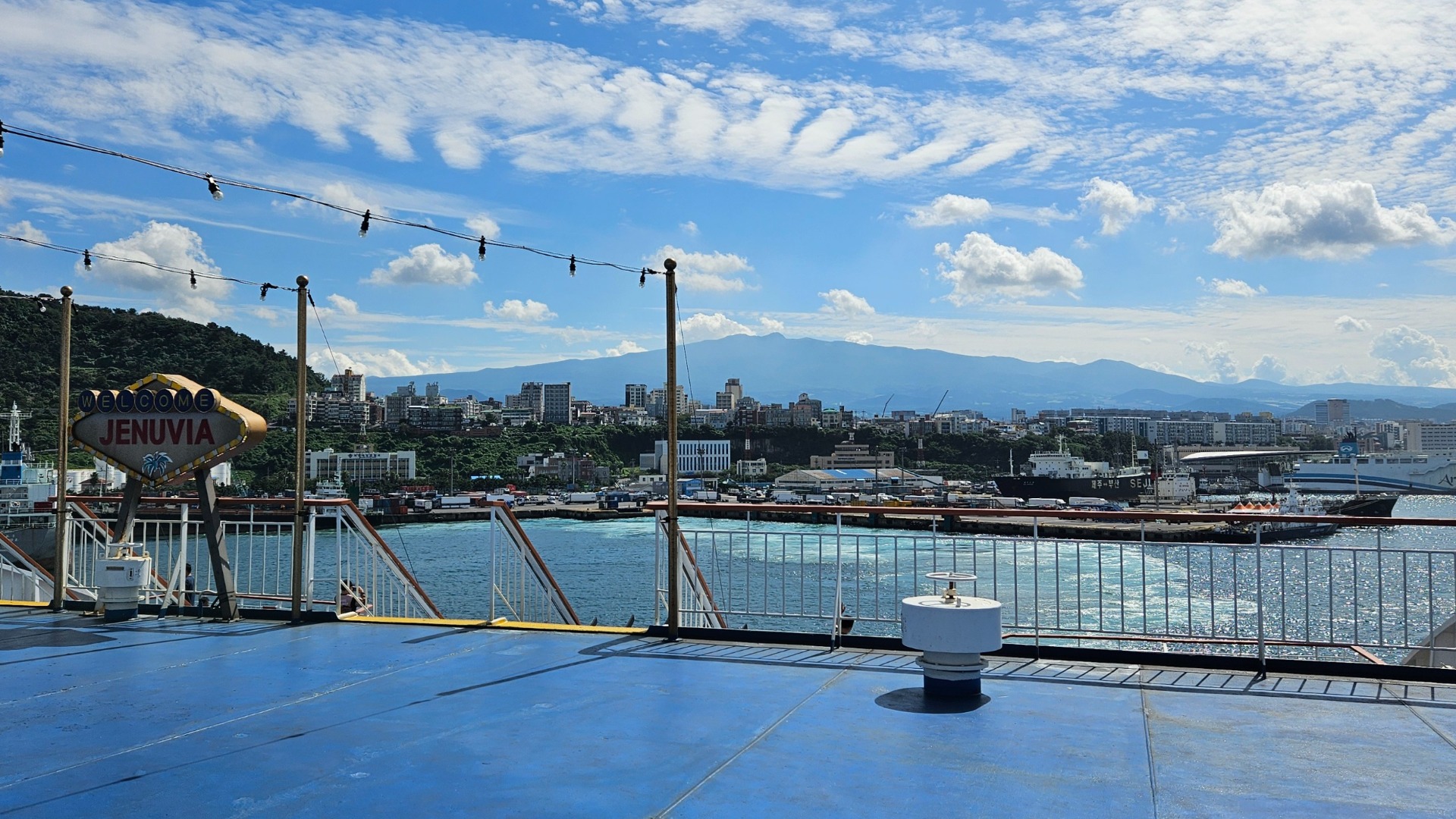 Ohromnou lodí za krásného počasí, s výhledem na Hallasan a okolní sopky, jež s přibývající vzdálenosti pomaličku mizely v dáli… Na Jeju jsme přiletěli letadlem, odplout lodí bylo rozhodně zajímavější a stylovější.