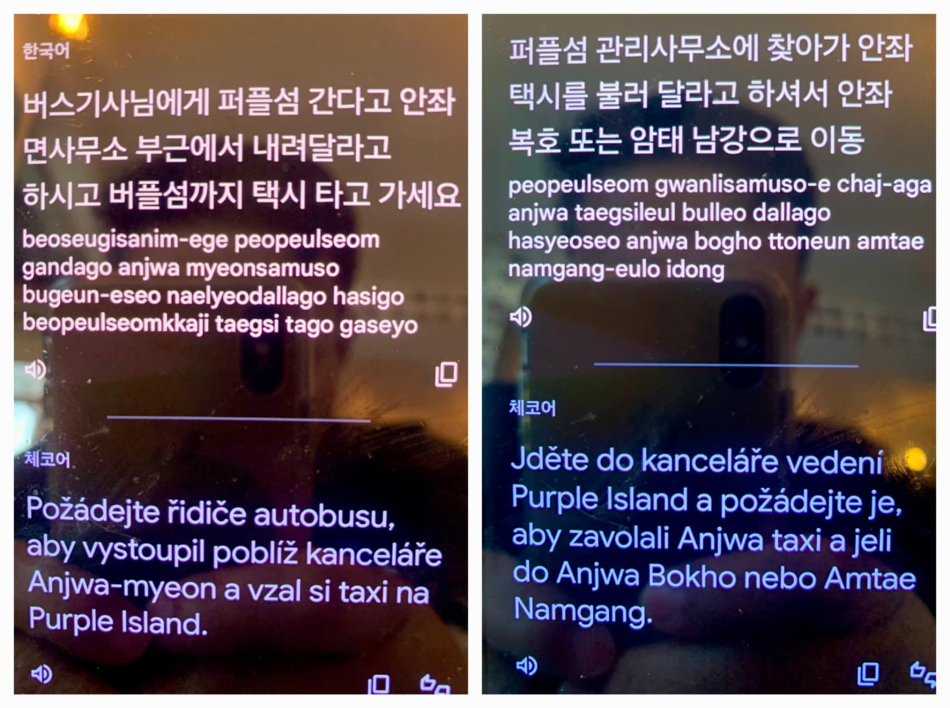 Pan domácí, proaktivní pán ve středních letech, nadšen mými znalostmi korejštiny, před nás rozložil mapu a začal zapeklitě vysvětlovat, kterými autobusy a taxíky (množné číslo) pojedeme a jak budeme řidiče instruovat. Tehdy padla má schopnost porozumění a nastoupil překladač. Už jsem psala, jak moc je nemáme v lásce, že? Jsou nepřesné a nedokážou zachytit některé jazykové nuance – zde kupř. absenci korejských zájmen. Ve výsledku měl místo nás na zastávce vystoupit řidič autobusu a na zpáteční cestě si nějaký úředník vezme taxíka a my snad abychom mu kancelář mezitím pohlídali!