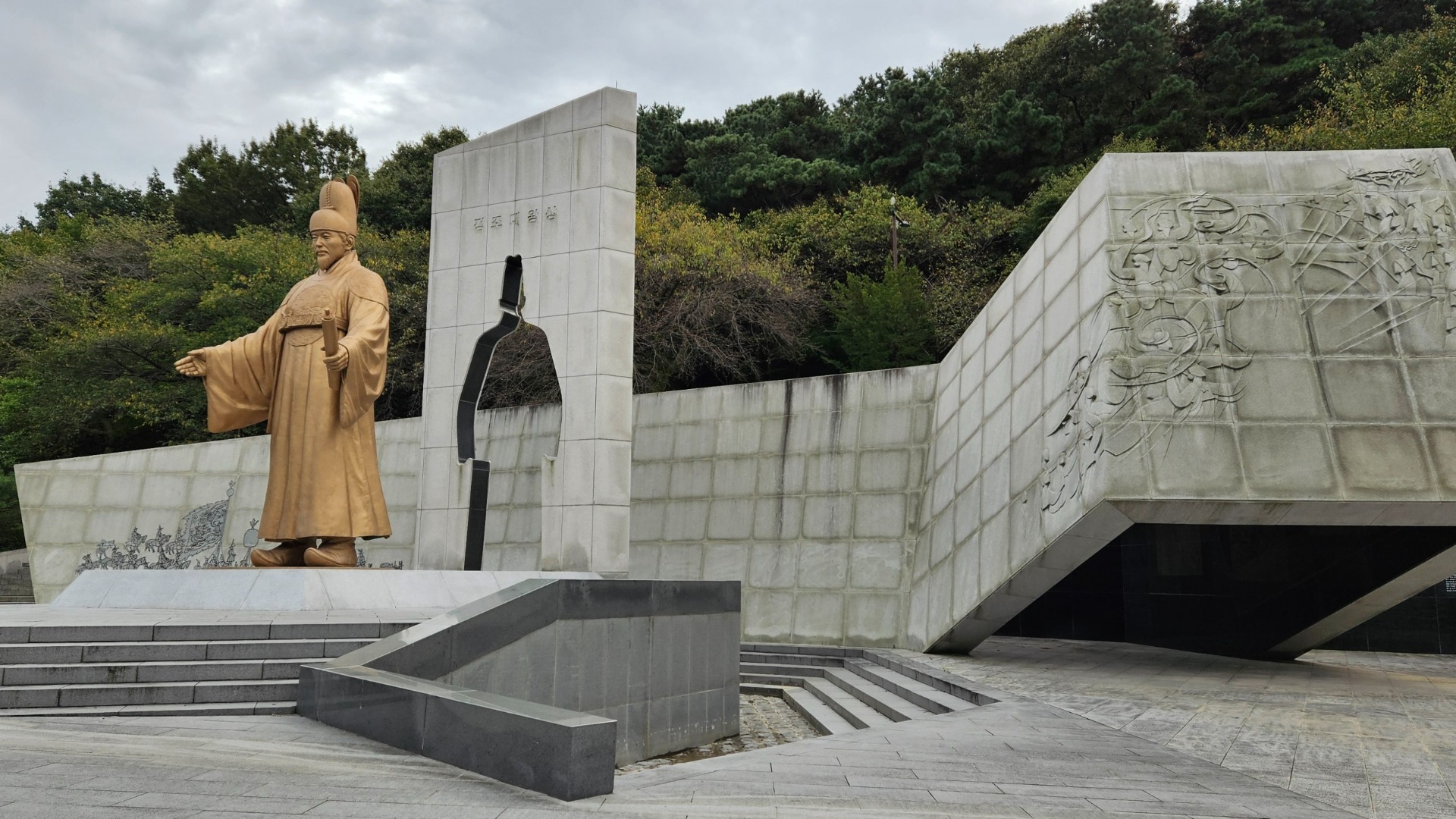 Socha krále Jeongjo v nadživotní velikosti stojí kousek nad palácem pod hradbami.
