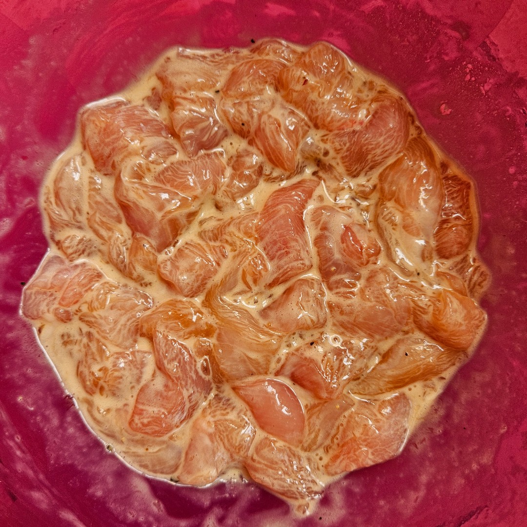 V misce rozmíchejte všechny ingredience ze sekce "maso" (kromě kuřecích prsou), kuřecí prsa nakrájejte na kostičky nebo nudličky, ponořte do směsi a promíchejte, aby se maso dobře obalilo. Nechejte marinovat.