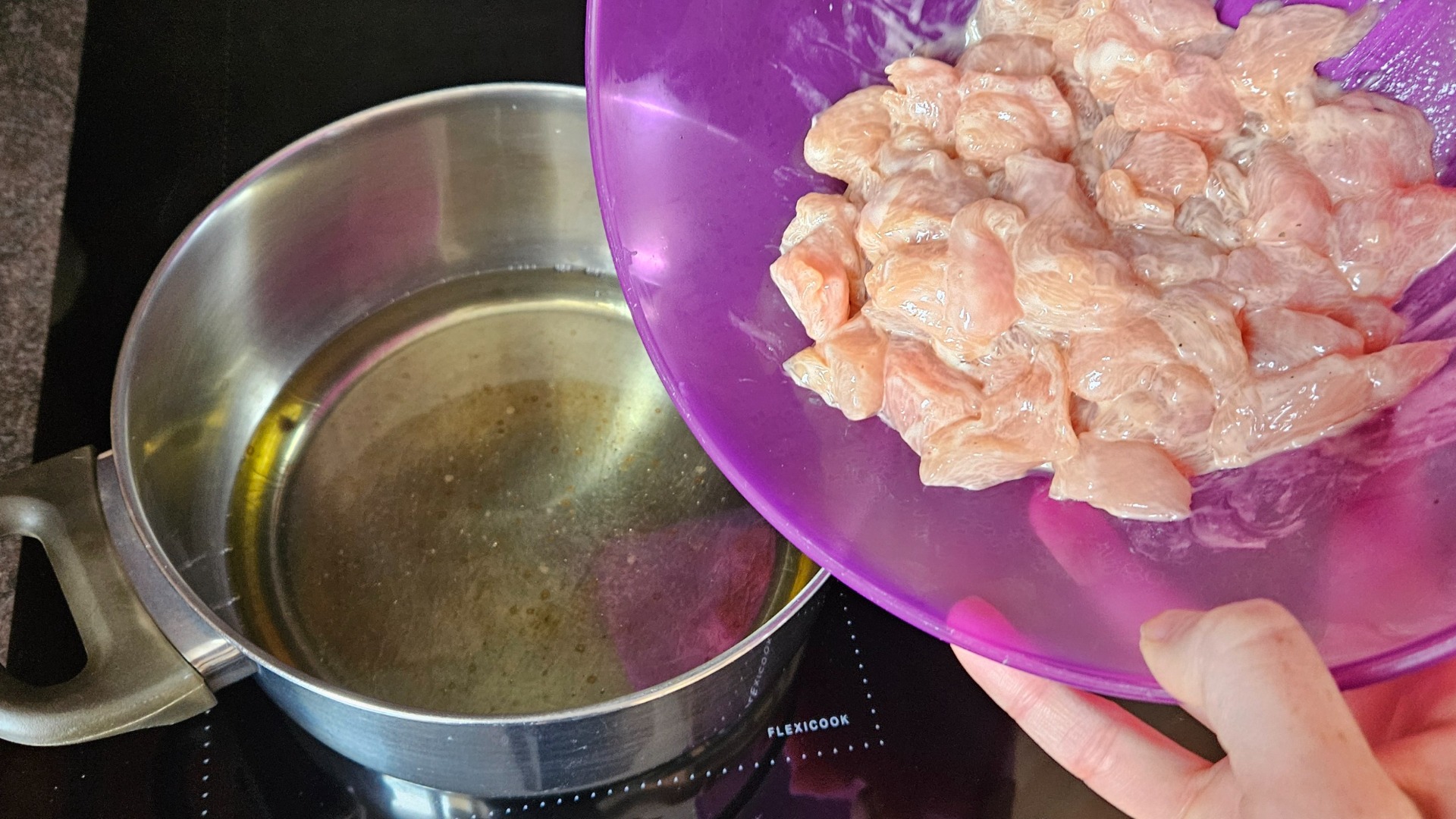 Do hrnce střední velikosti nalijte 300 ml oleje, zapněte vařič na nejvyšší výkon a počkejte pár minut. Olej začne být horký, což poznáte tak, že se na hladině vytvoří drobné bublinky. Poté do něj vložte maso a okamžitě rozdělujte jednotlivé kousky, aby se neslepily (já používám hůlky, ale pomoci si můžete i vidličkou nebo malou vařečkou).