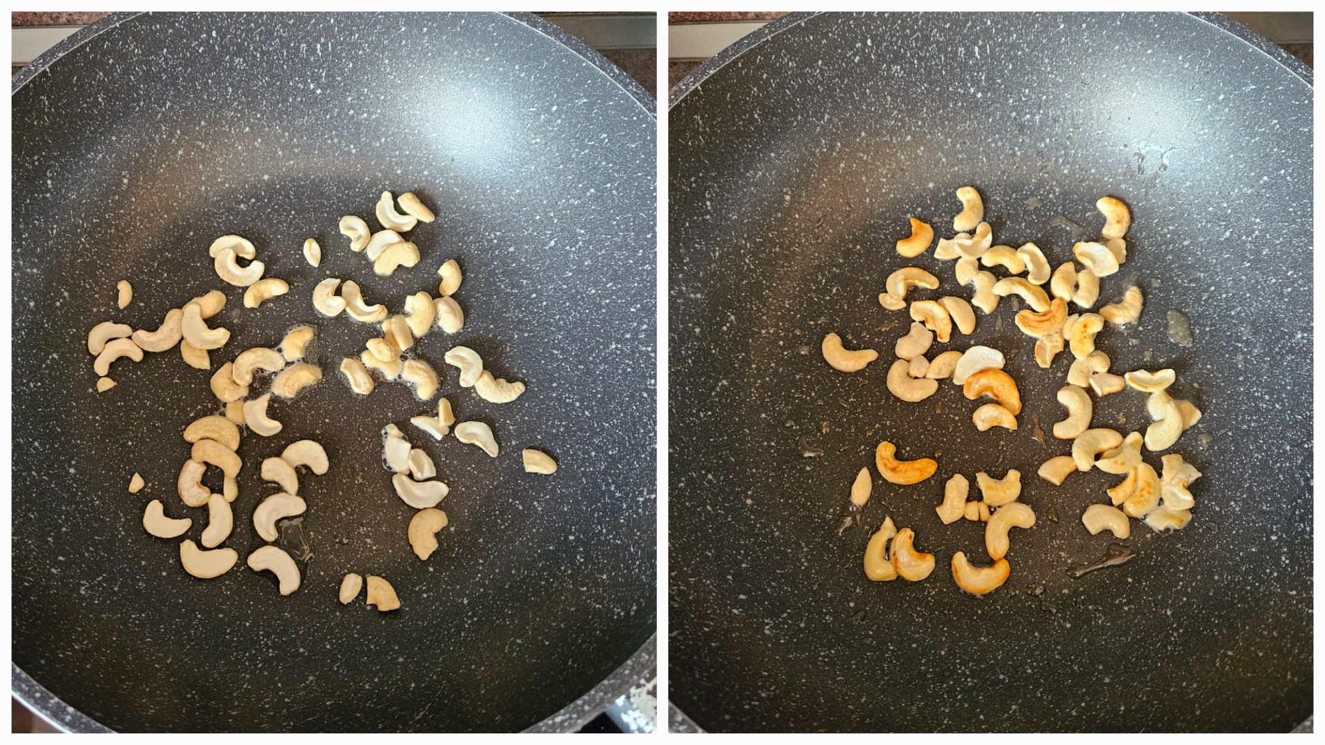 Na pánvi rozpalte trošku oleje a nasypejte oříšky. Za občasného promíchání pražte pár minut, dokud nezhnědnou. Poté je z pánve přesuňte do misky.