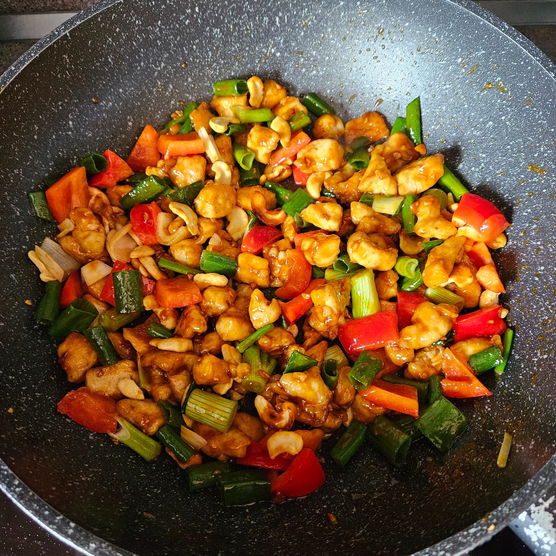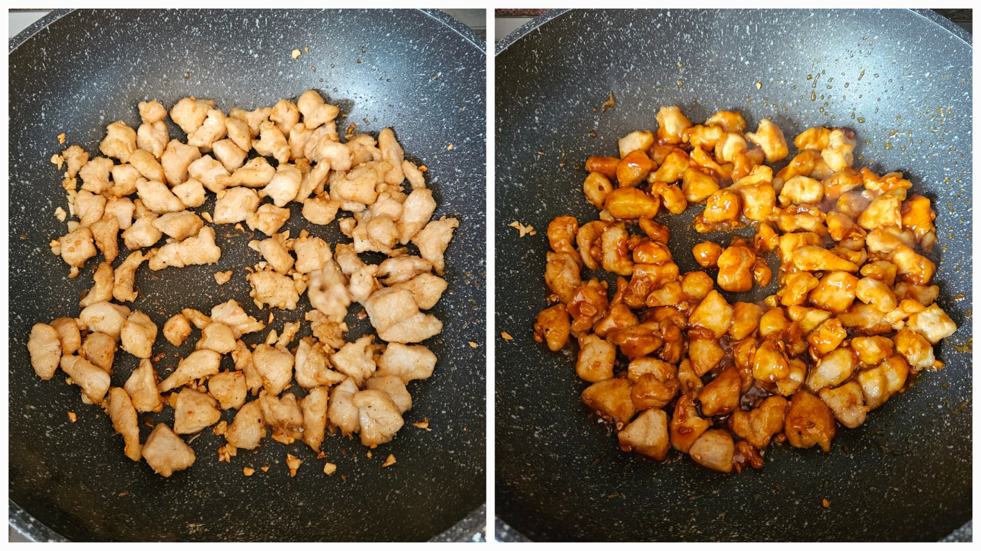 Poté přidejte předem připravenou zálivku a smíchejte dohromady. Za minutu zálivka trochu zhoustne. Nakonec nasypejte jarní cibulku, papriku a oříšky, vše smíchejte dohromady a odstavte z vařiče. Poslední ingredience zůstanou křupavé, kdežto maso je měkké a šťavnaté, což vytvoří osvěžující kontrast.