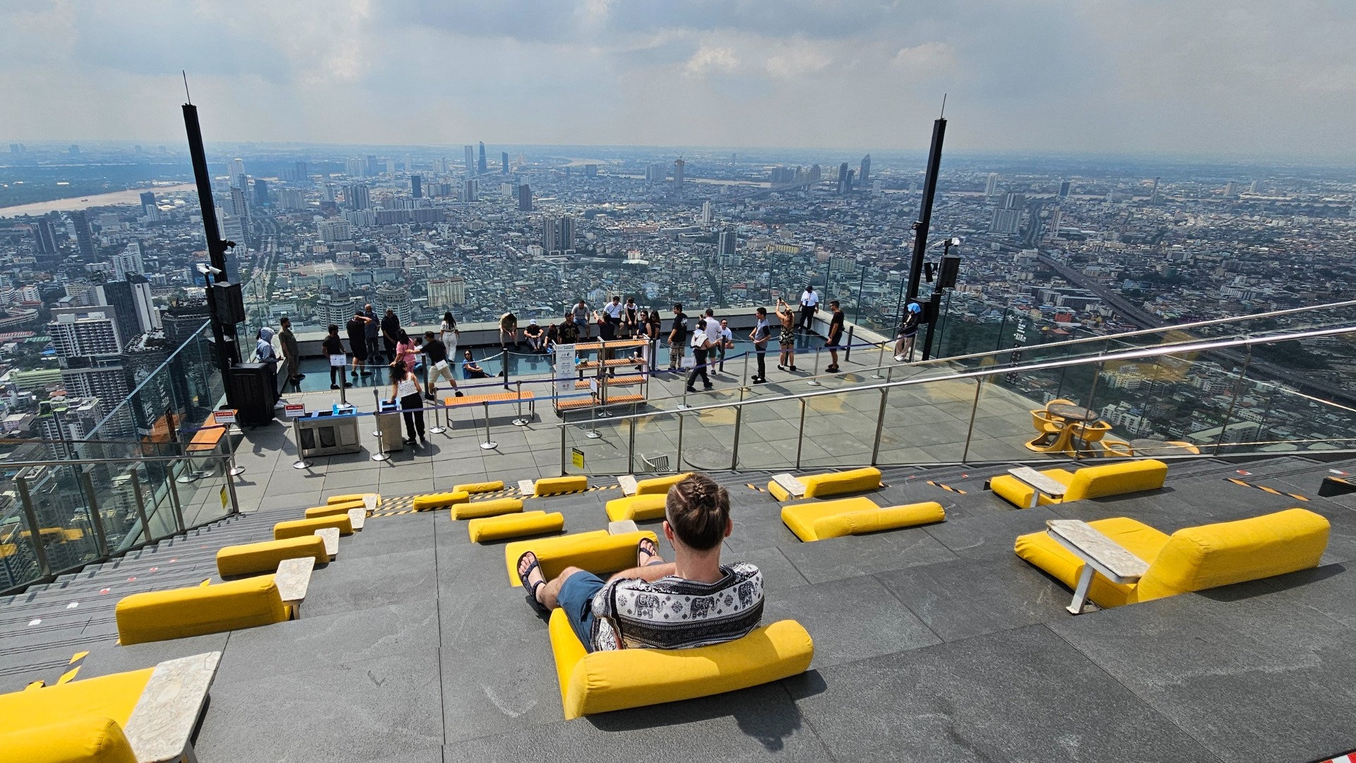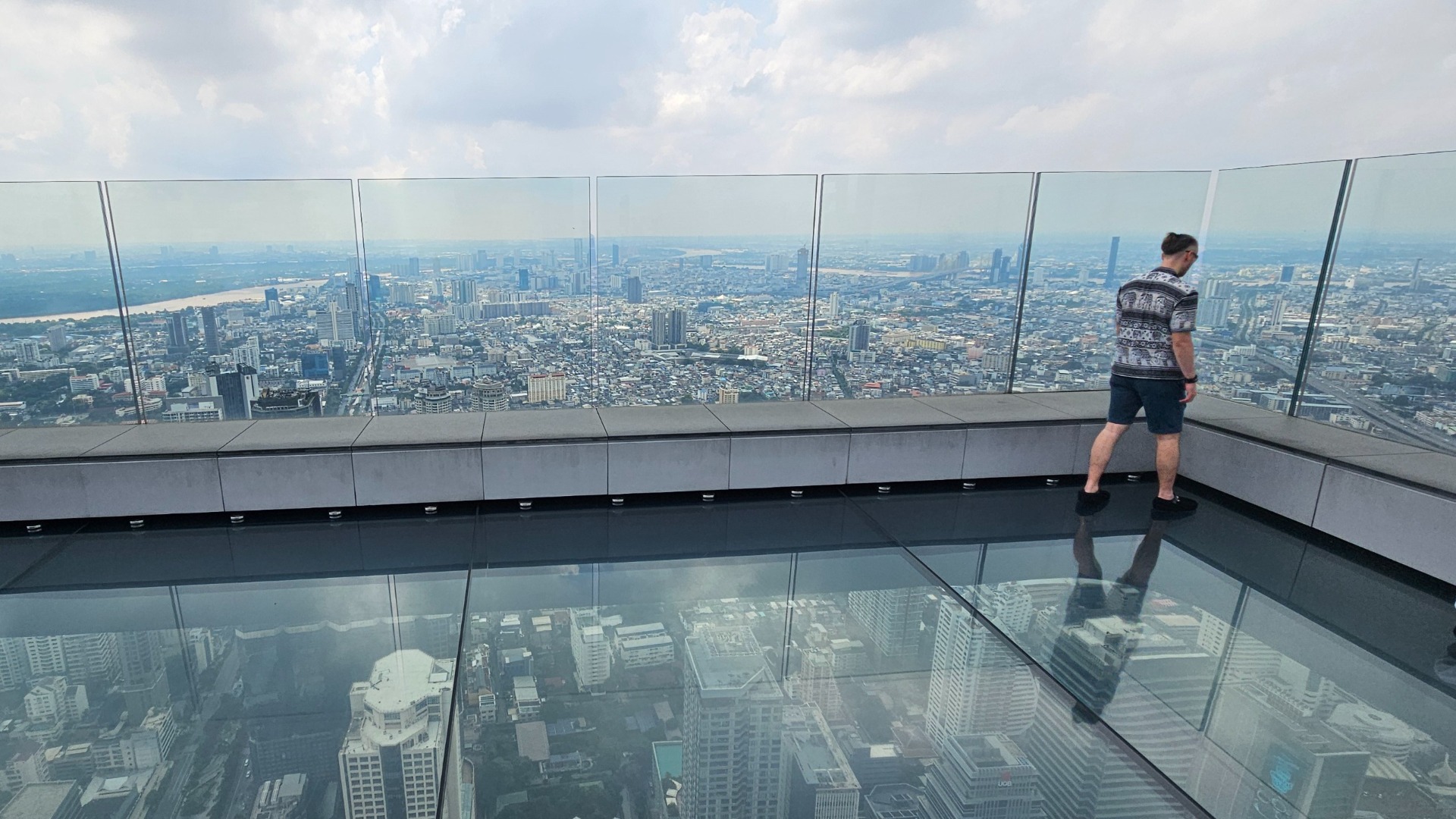 Během monzunového období je statisticky větší šance na dešťové přeháňky odpoledne, proto jsme u něj byli pár minut po otvíračce v 10 hodin ráno. 1000THB (asi 650 korun) coby vstupné je docela raketa; možná proto tam nebyly fronty. Výtah nás vyvezl do nejvyššího uzavřeného patra, odkud jsme vyšli ven na vyhlídku ve výšce 314m.