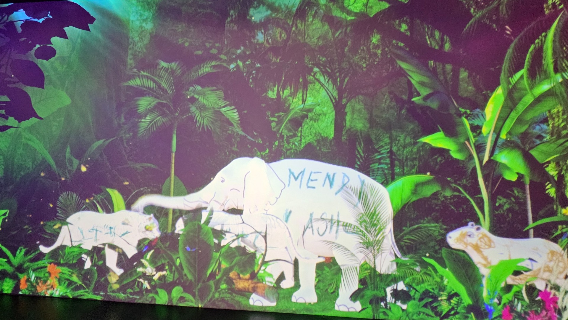 V jedné místnosti můžete pomalovat malou bílou šablonu zvířete, vložit ji do snímače a její rozpohybovaná projekce následně běhá na stěně mezi dalšími čtyřnohými savci. Vybrali jsme samozřejmě toho největšího, aby byl vidět.