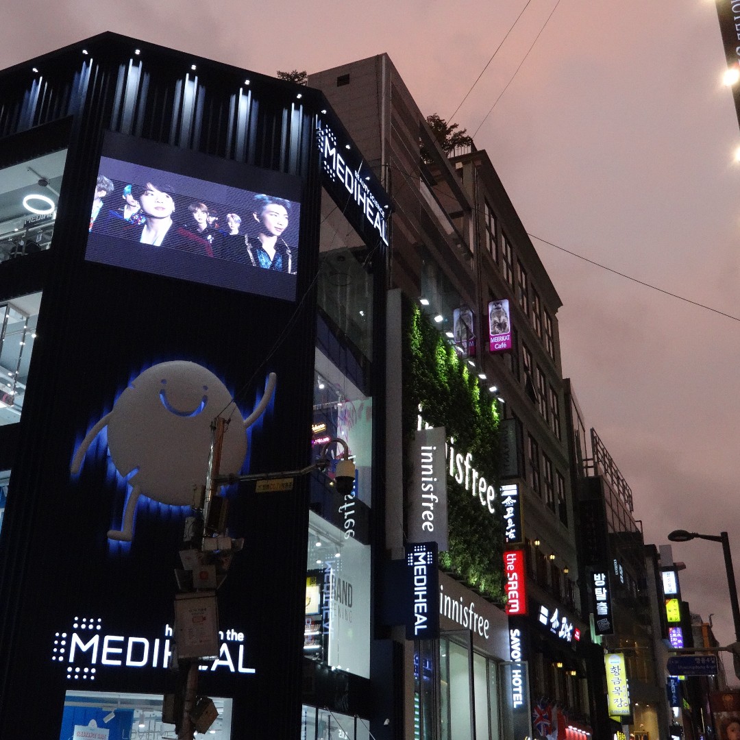 Náš hotel stál vedle rušné čtvrti Myeong-dong, která je známá svým nočním životem, nákupními třídami a pouličním jídlem. Budiž také všem na vědomí dáno, že jsme v zemi tzv. "vlny hallyu", což znamená, že se v ní na mnoha místech vyskytují kpopoví a kdrama idolové v nejrůznějších tvarech, barvách a formách. To může následně znamenat peklo pro peněženku, ale hřejivý pocit na duši.
