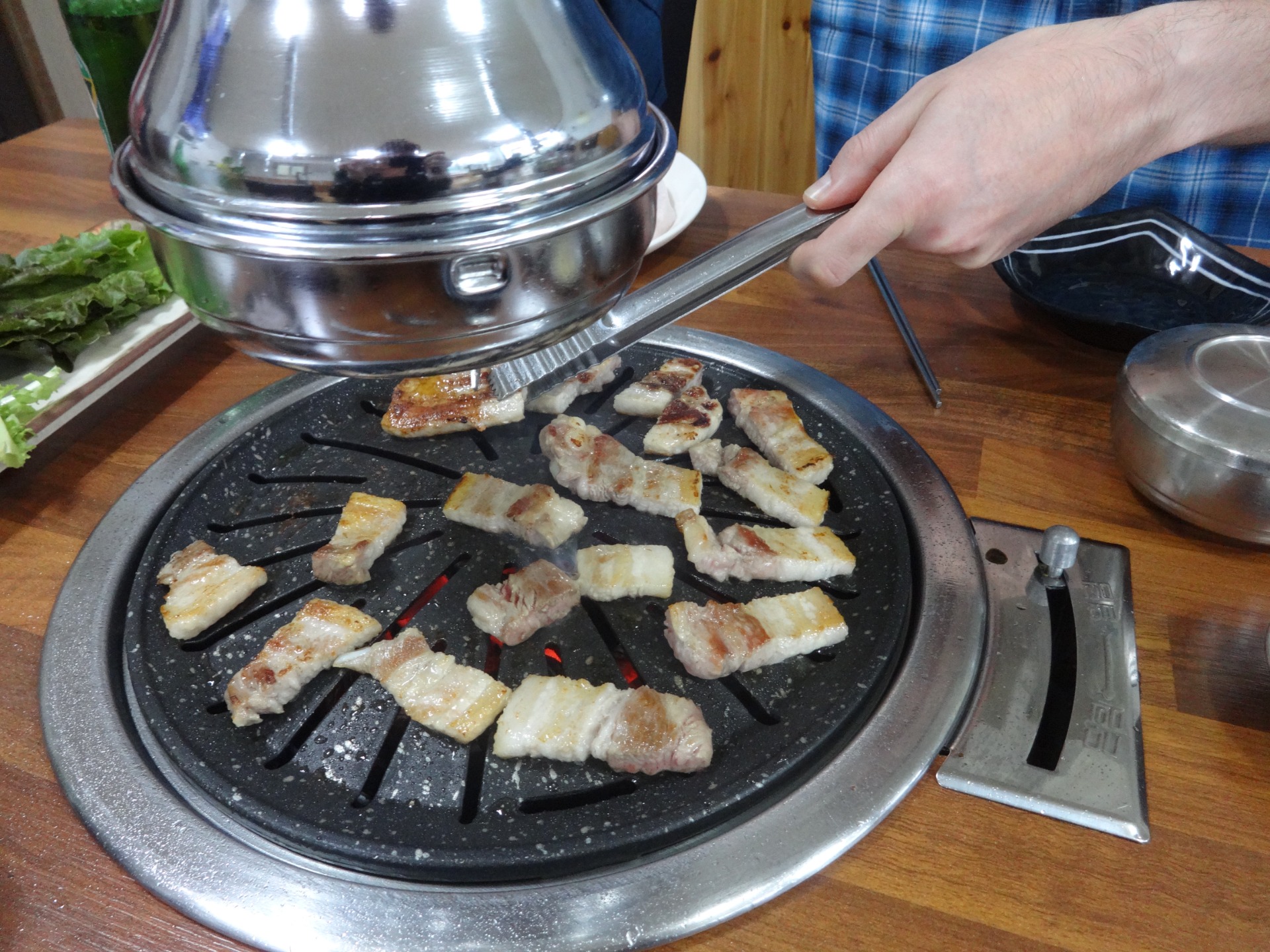 Hledali jsme příjemnou barbecue restauraci, kde bychom slušně pojedli, ale nakonec jsme našli něco lepšího – zapadlou špeluňku místního dědy. Usadil nás do malé místnosti za stůl vedle komínů přepravek na pivo. Jediná cedule na stěně hlásala v korejštině výběr různých druhů vepřového, tak jsme něco vybrali a čekali, co bude dál. Děda zapnul odsávačku, donesl žhavé dřevěné uhlíky do grilu na našem stole, začal ho obkládat masem, rýží, omáčkami, perilovými a jinými listy, mističkami s přílohami (banchany / 반찬), přinesl i nůžky na stříhání masa…zázrak.