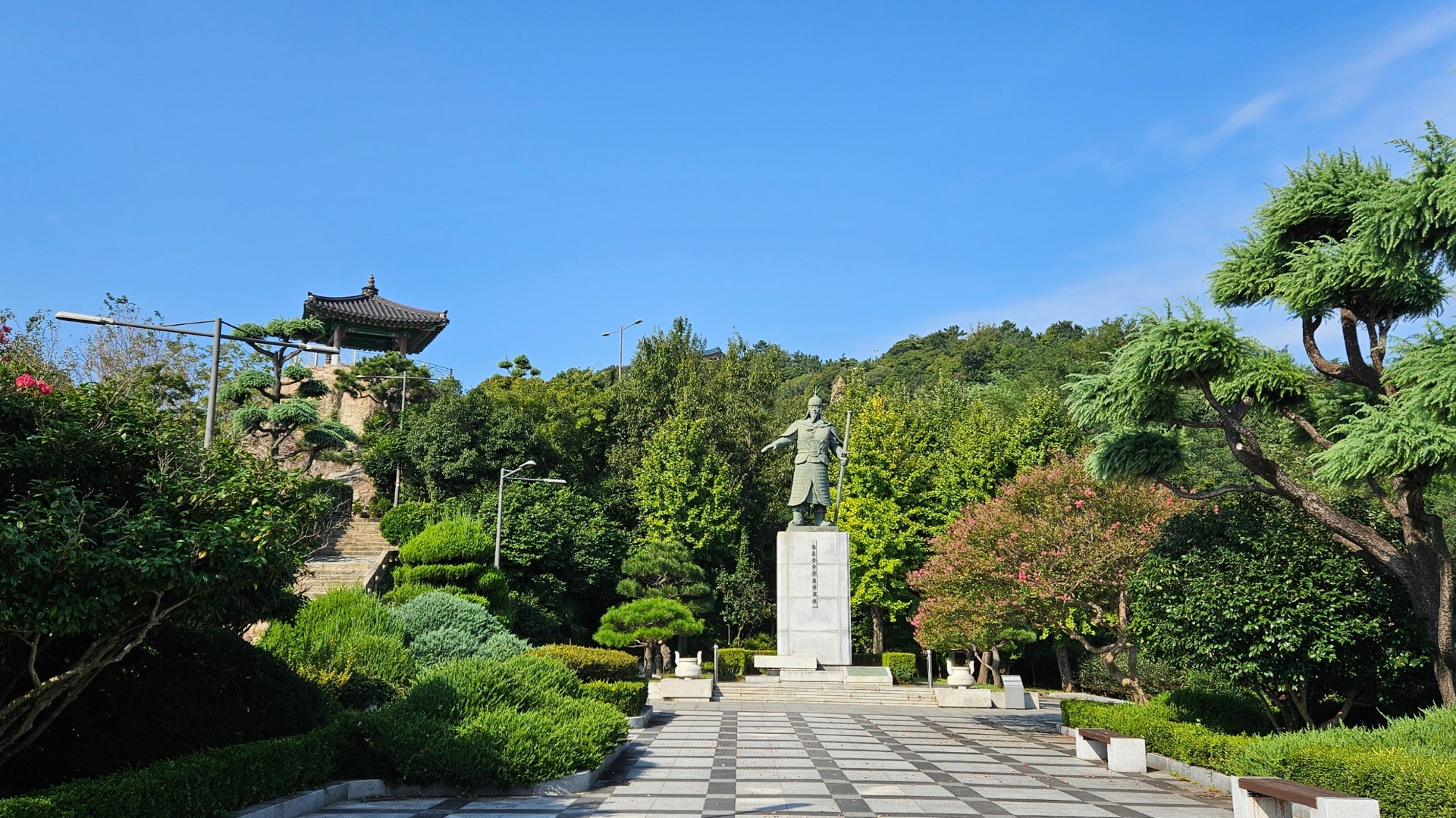 Nástupní místo ke krátkému výšlapu střeží náš starý známý, admirál Yi Sun-shin. Pobýval zde se svými jednotkami během Imdžinských válek na konci 16. století (snaha Japonců o invazi do Koreje).