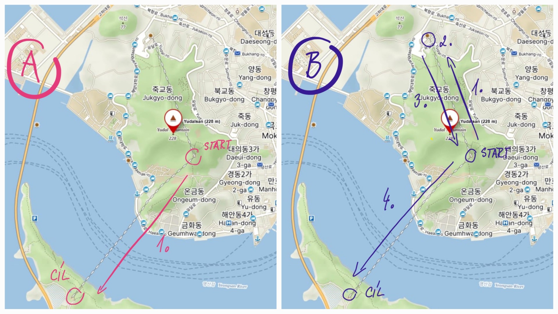 Z vrcholu Yudalsanu jsme sešli asi 200m ke stanici lanovky s představou snadného přesunu na ostrov Gohado (obr. A níže znázorňuje ideální situaci). No, to jsme si zase malovali svět růžově…