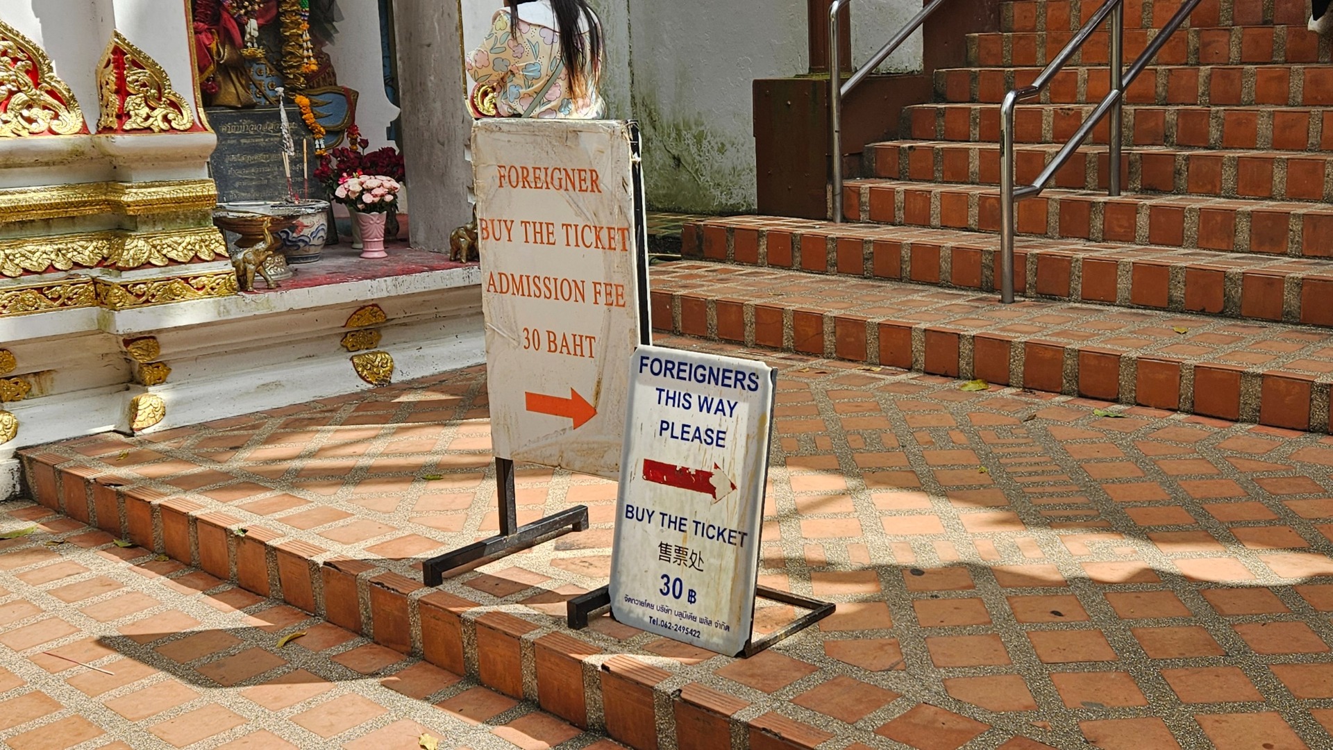 Informace na vývěsce zněly jasně: Doi Suthep soukromá jízda 400THB / sdílená pro 8 osob 100THB na hlavu. Hodlali jsme usednout a čekat do naplnění kapacity. Kdo ale čekat nehodlal, byl řidič. Z jeho nadšených gest jsme vyvodili získanou slevu. Právě dnes, pokud pojedeme my dva hned teď. Holt nebyla sezóna, dalších 6 Godotů vůbec nemuselo přijít. Tak jsme si plácli a zaplatili 300 bahtů za odvoz.