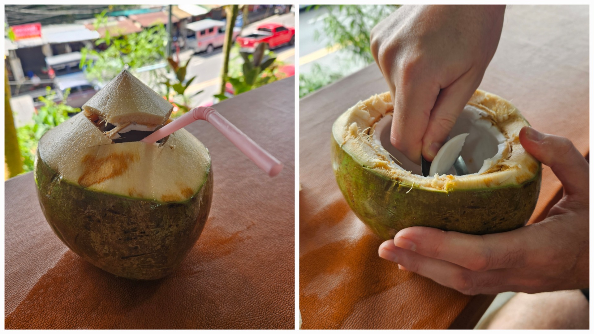 …a pod chrámem si dali kokosovou svačinku s výhledem na rušnou příjezdovou cestu. Z mladého kokosu jsme nejprve vypili osvěžující sladkou vodu, a posléze stánkař kokos osekal, abychom mohli vydlabat dužinu.