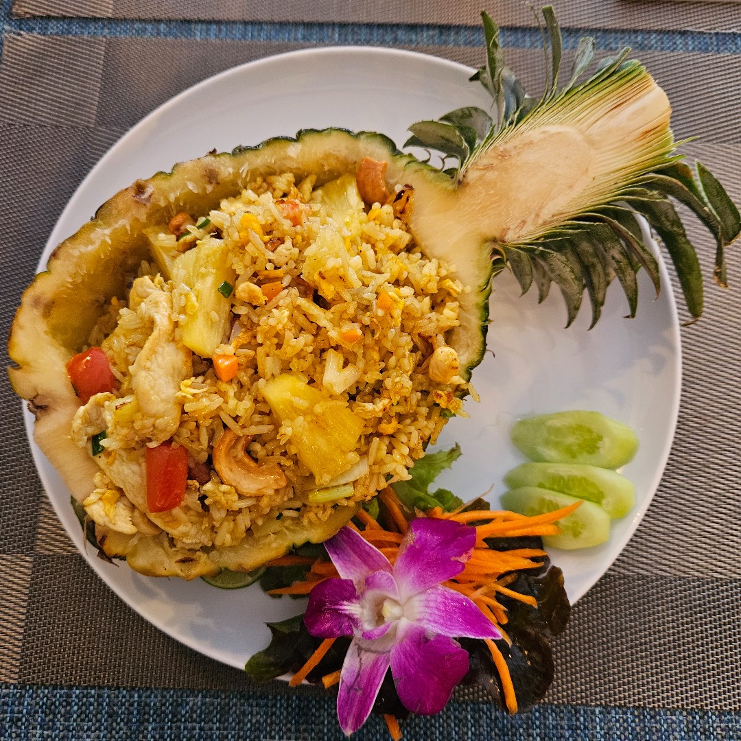 Člověk odejde na nevinnou procházku do hor a nakonec je z ní vyčerpávající vzdělávací výprava. Všichni ti kohouti, sloni, sfingy a ovce… K jídlu pouze jeden kokos a i ten ještě šérovaný s drahou polovičkou. Chtělo to pořádné živiny, zasytit bříško a potěšit oko. Šli jsme na jistotu do téhož bistra jako předchozí den a dali si gáblík - celkem normálně chutnající směs rýže, kuřete, ananasu, ale ta vizuální prezentace!