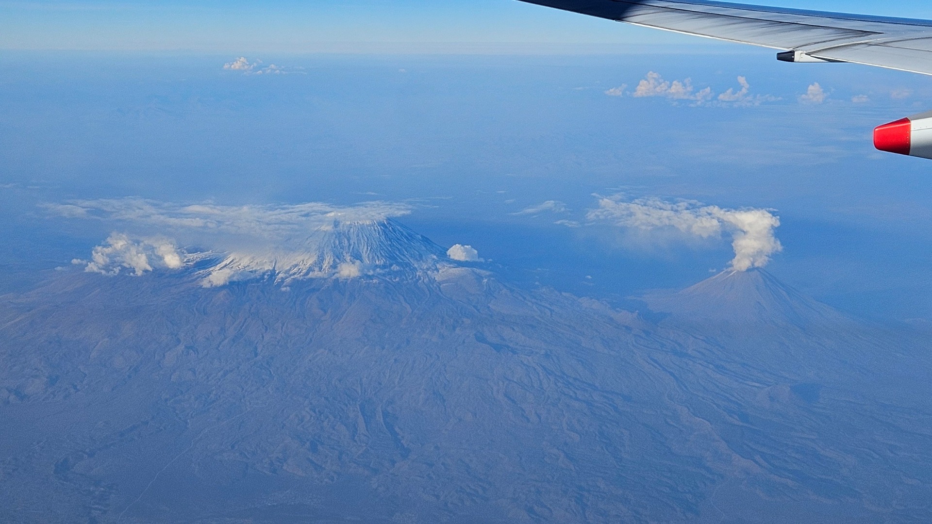 …let trval 12 hodin. 12 hodin! Na druhou stranu, krmili nás dobře, na sedadle u okýnka vedle nás nikdo neseděl (bylo to patrně jediné neobsazené místo v celém letadle, považte to štěstí!), obrazovky před námi fungovaly, nový typ letadla (A350-900) byl celkem dobře odhlučněn, ale stejně. Po obědě jsme povinně museli zatáhnout všechna okna a spíme. Jenže nespíme! Nejsme unavení! Chceme si číst, dívat se z okna, povídat si! Ne. Jen jednou se mi povedlo nenápadně povytáhnout kryt okýnka a naskytla se nám úchvatná podívaná na sopky kdesi nad Ázerbájdžánem.