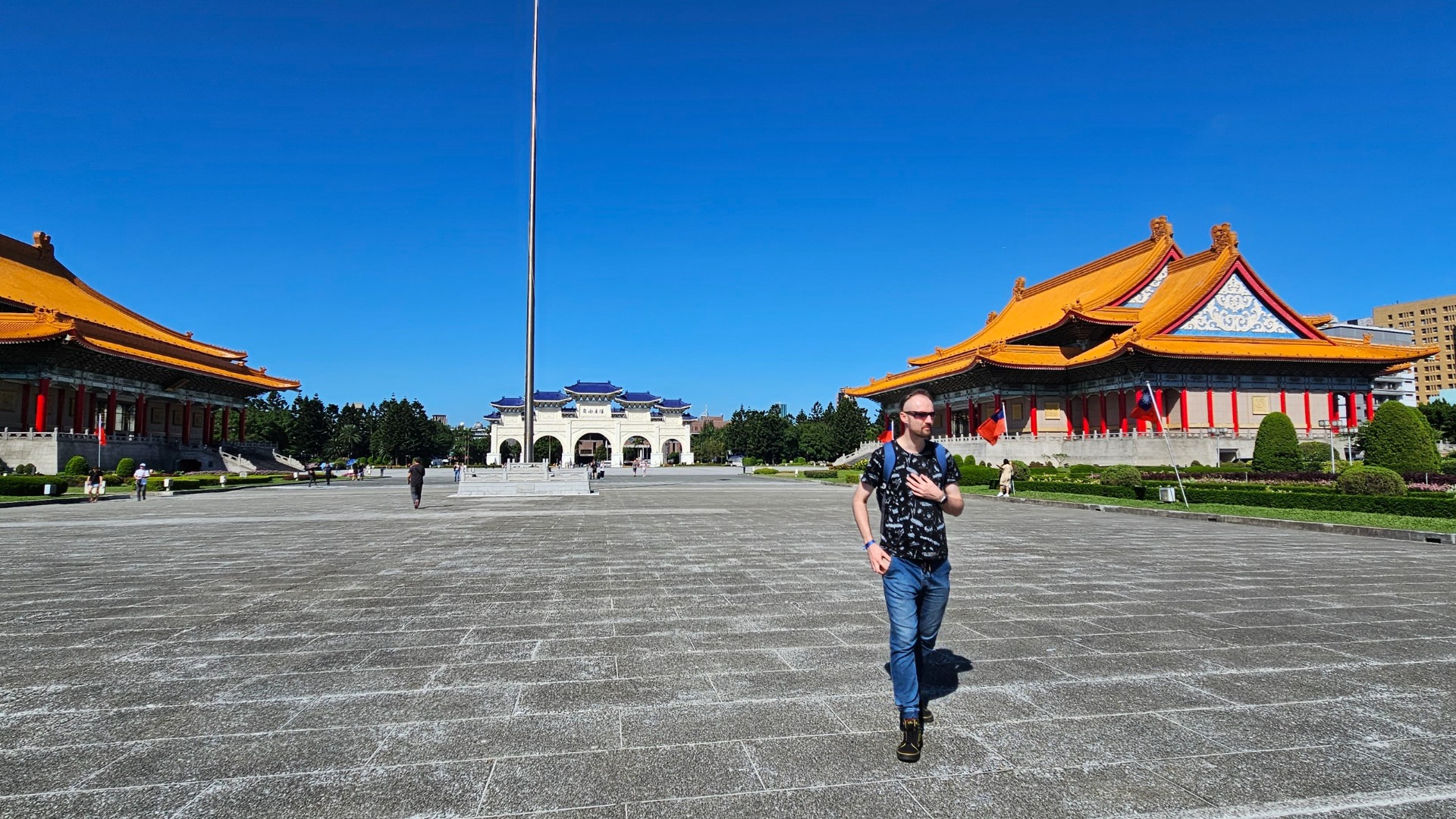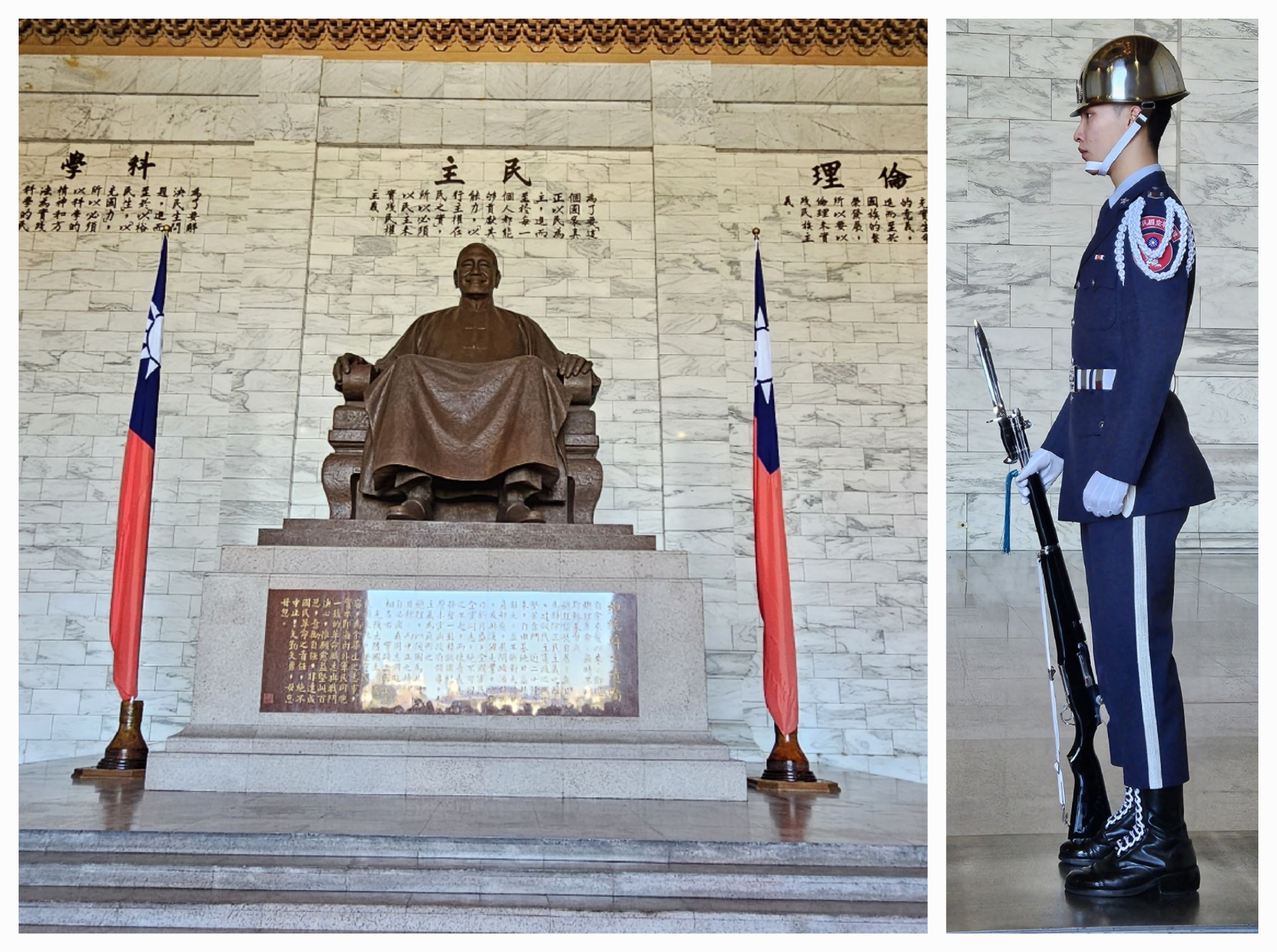 Chiang Kai-Shek Memorial Hall je impozantní síň věnovaná památce bývalého prezidenta. Uvnitř je socha blaženě se usmívajícího Čankajška v nadživotní velikosti hlídaná bdělou stráží mladistvého (a poněkud hubeného) vzezření. Jejich střídání, probíhající každou celou hodinu, je oblíbenou turistickou atrakcí, na kterou lidé čekají i 15 minut před začátkem. Nebyli jsme na to připravení, tak jsme na první pokus přes ty davy nic moc neviděli. Nevadí, příležitostí ještě bude dost.