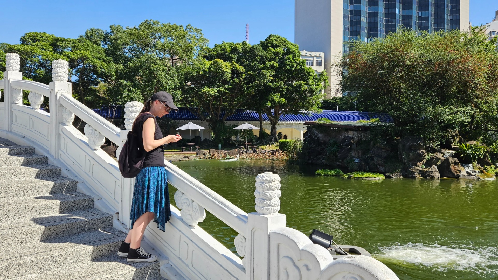 Vedle areálu je schovaný maličký parčík s jezírkem a kapry koi. Jelikož je máme rádi (Marek teda víc než já), padly naše první taiwanské mince na jejich krmení. To byla bitka! Kdo se víc nají – ti malí/rychlejší nebo ti větší/silnější? Dozvíte se na konci.