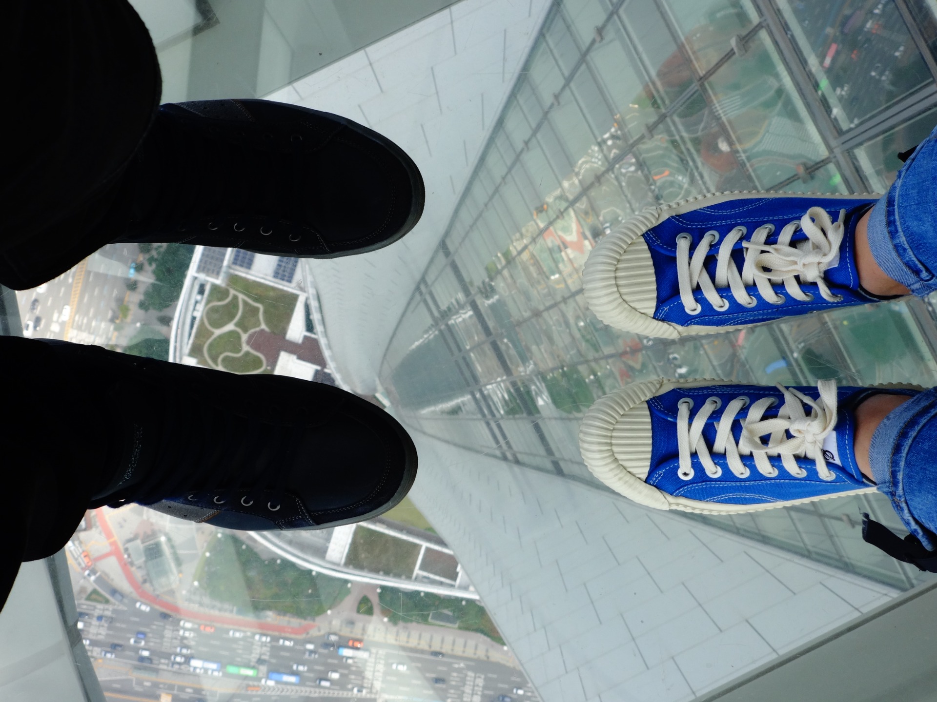 Standardem na místech, kde je považováno za vzrušující a/nebo děsivé koukat z výšky dolů, jsou skleněné podlahy. Setkali jsme se s nimi na mrakodrapech, výletních lodích (aby byl vidět ten prázdný písek bez ryb), mostech, a dokonce lanovkách. Tady byla taky.