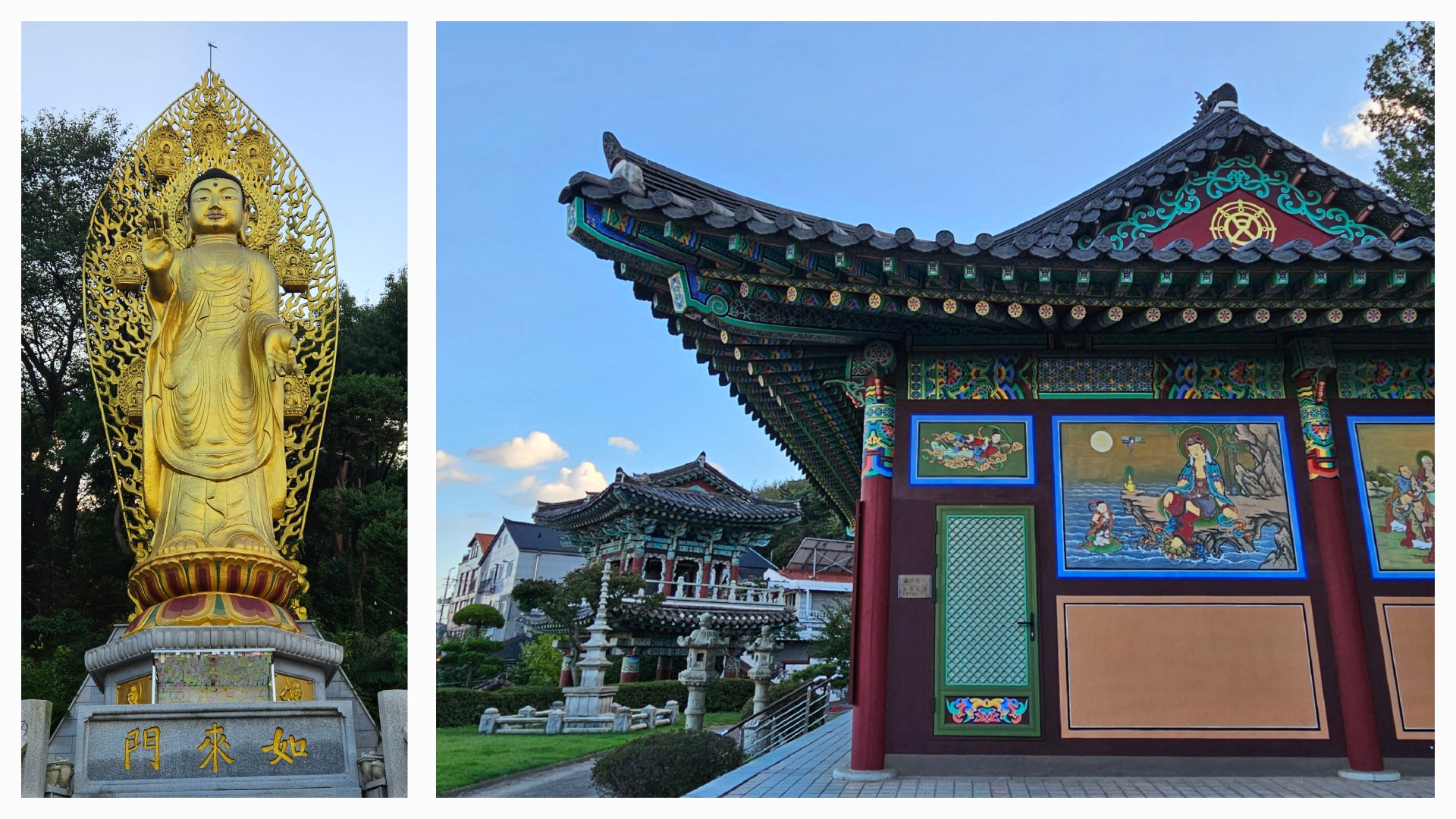 Pod hradbami u jižního východu stojí dva buddhistické chrámy, z nichž jeden se pyšní ohromnou sochou pozlaceného Buddhy…