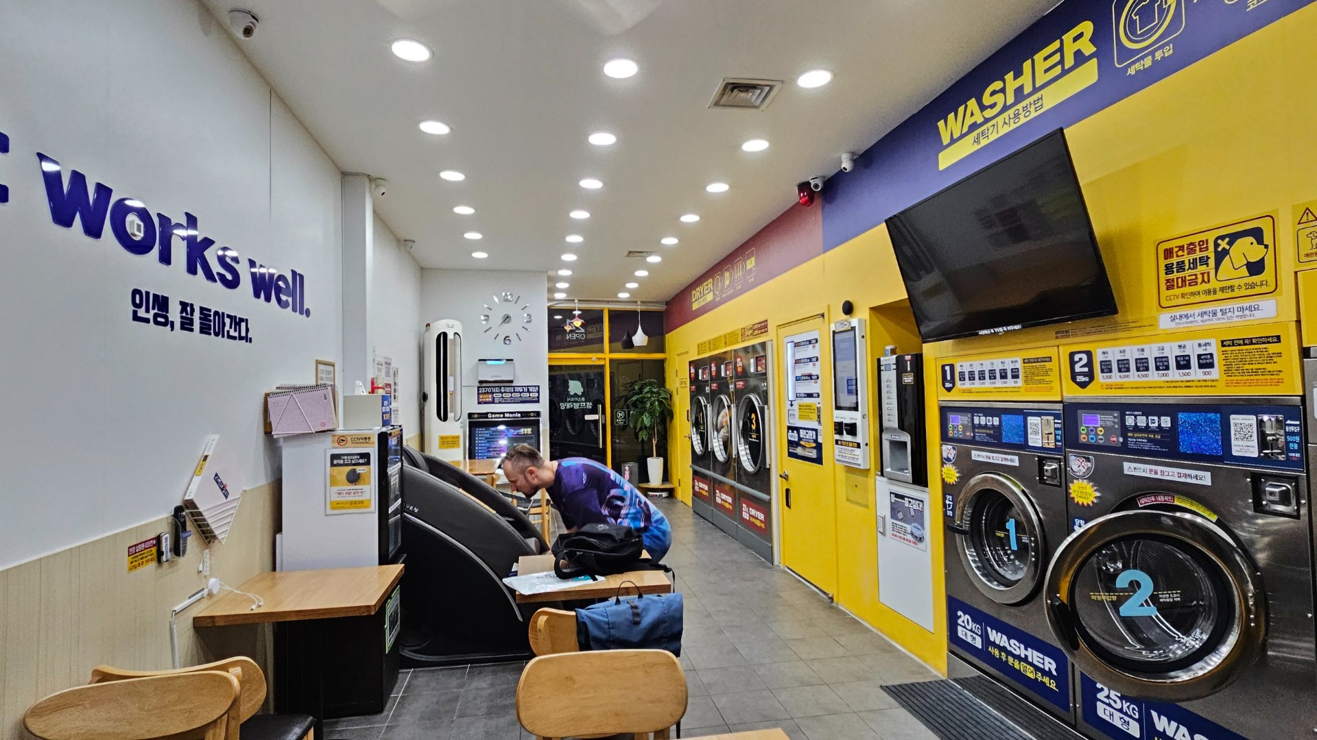 Vybaveni zkušenostmi s obsluhou pračky z hotelu v Soulu jsme sebevědomě zamířili 2km do náhodou objevené prádelny. Měli jsme s sebou všechno od bund až po spodní prádlo, co bychom to třídili!