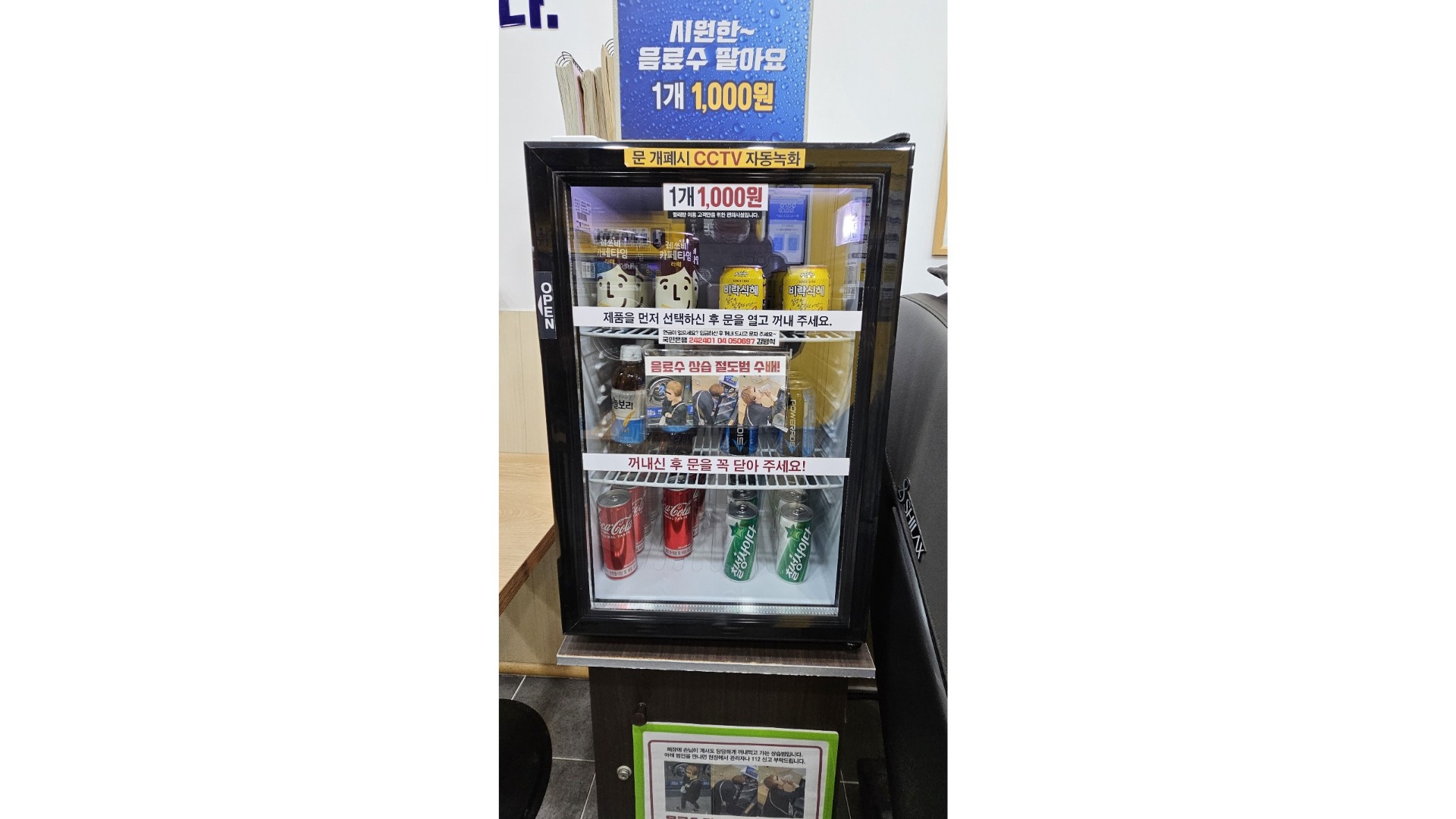 Na principu poctivosti funguje i chladnička s nealko nápoji – otevřete, vezmete si nějaké pití a za každé necháte v boxu nahoře 1000 wonů. Běda, jestli ne, Velký Bratr CCTV vás nahlásí příslušným úřadům (jako tu paní na fotce).