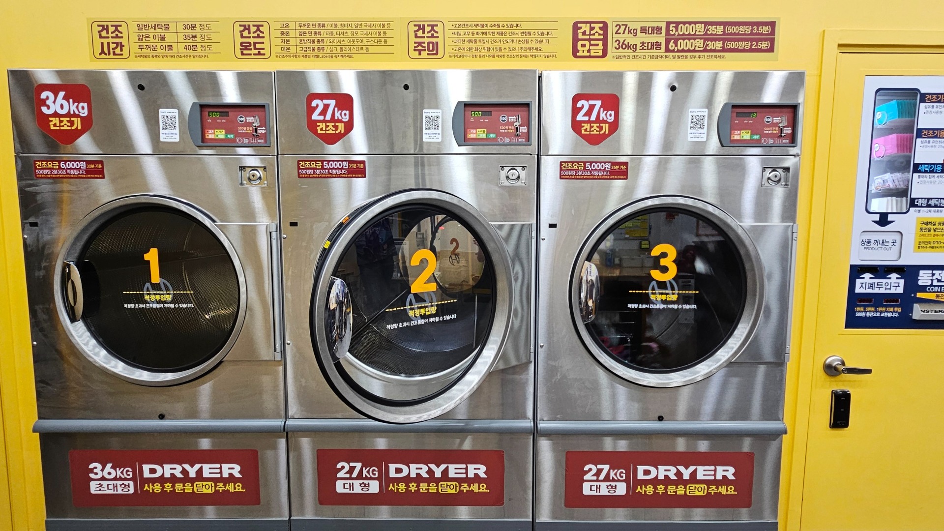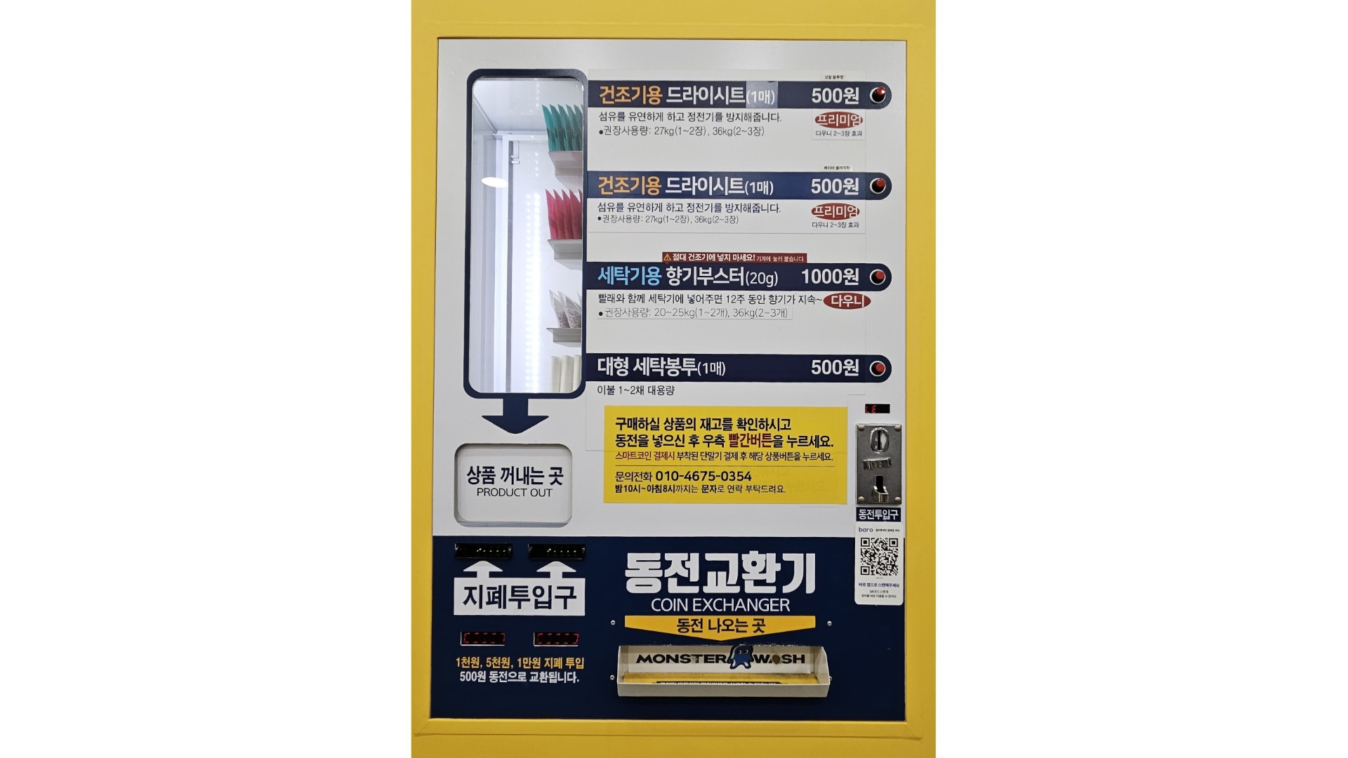 Automat vám rozmění jakoukoliv korejskou bankovku na jednotlivé mince v hodnotě 500 wonů. Za ty následně pořídíte (v tomto pořadí z vrchu): zelený nebo růžový vonný ubrousek do sušičky, posilovač vůně do pračky, pytel na lůžkoviny. Všechno je dobrovolné, výkonné stroje pracují efektivně i bez přidané hodnoty.