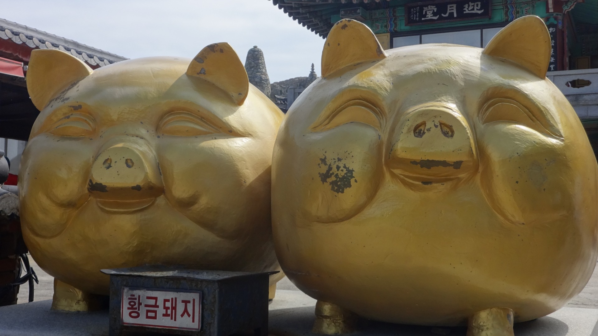 V chrámovém komplexu naleznete pozlacené sedící Buddhy, pozlacené ležící Buddhy, pozlacená prasátka, mini Buddhy, sochy zvířat čínského horoskopu. Co tam ovšem nemají a Marka iritovalo ze všeho nejvíce, je vstup do moře na koupání. Na to mám hned dva argumenty – Korejci versus plavání + mniši a jejich úplně jiné starosti. Tuším, že chrám nebyl postaven jako středisko volnočasových aktivit zaměřených na vodní sporty.