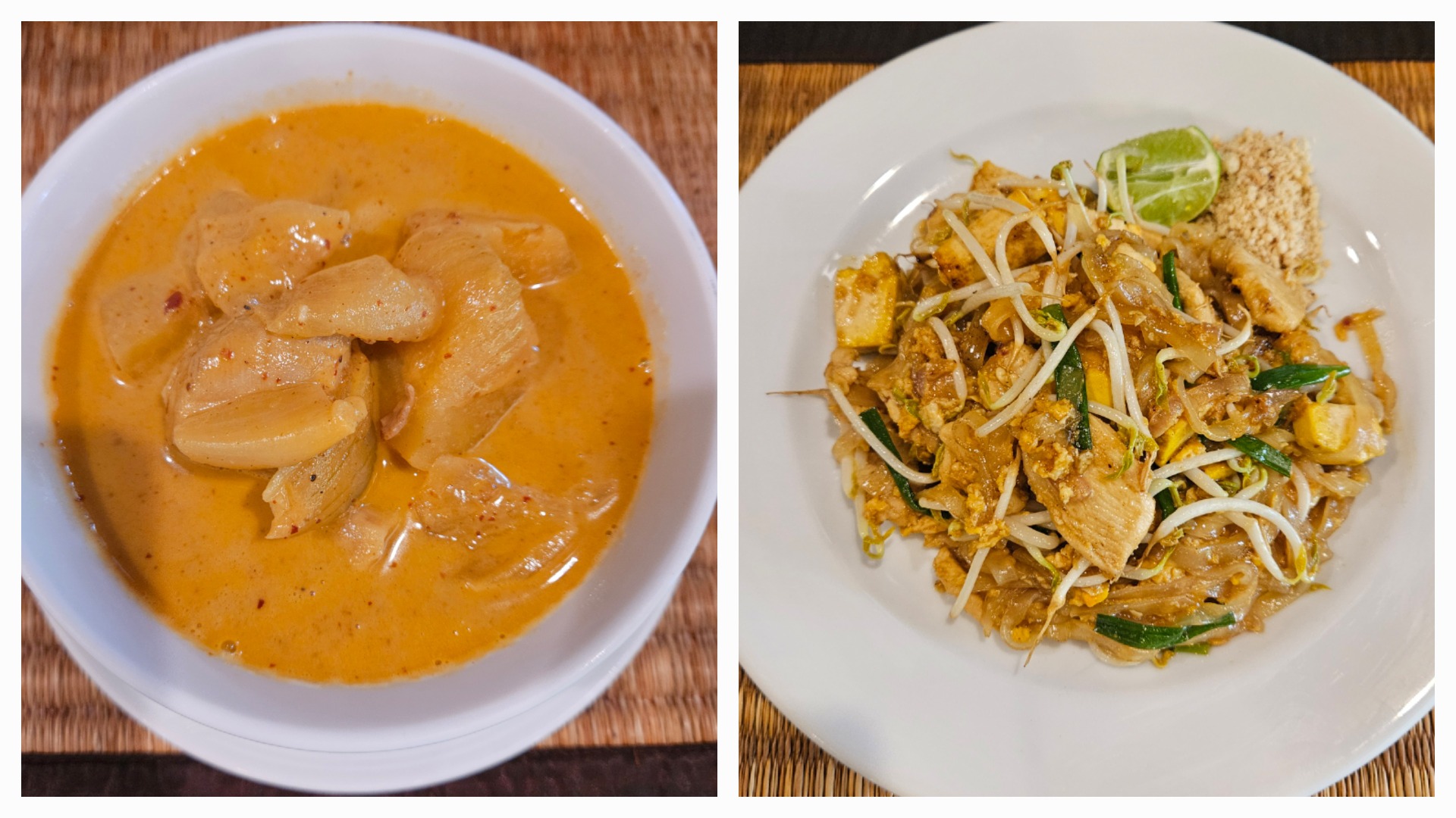 Návrat na hotel proběhl trochu uspěchaně, jelikož nás čekal ještě jeden program. Využili jsme služeb hotelové restaurace a pozdní oběd snědli tam. Marek měl chuť na kuřecí kari a já jsem si dala pad thai. Jedná se patrně o nejznámější thajský pokrm skládající se z restovaných rýžových nudlí, vajec, tofu, kuřecího masa či krevet posypaný jemně nasekanými arašídy. Zvláštní sladko-kyselou chuť dotváří trojkombinace rybí omáčka/cukr/limetka. Já tomuto jídlu udělila stříbrnou medaili v boji o nejchutnější thajské jídlo (zlato bere mango sticky rice) a plánuji ho zařadit do našeho domácího jídelníčku.