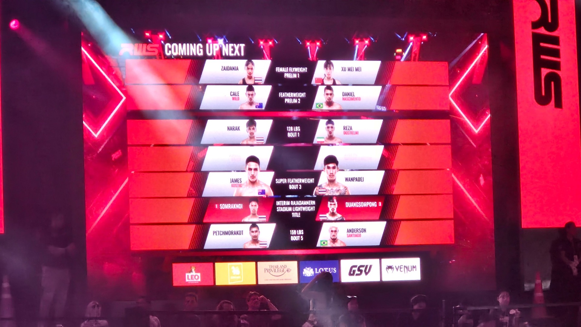 Karta soubojů obvykle obsahuje 7-8 dvojic zápasníků v různých váhových kategoriích. Bojují i ženy.