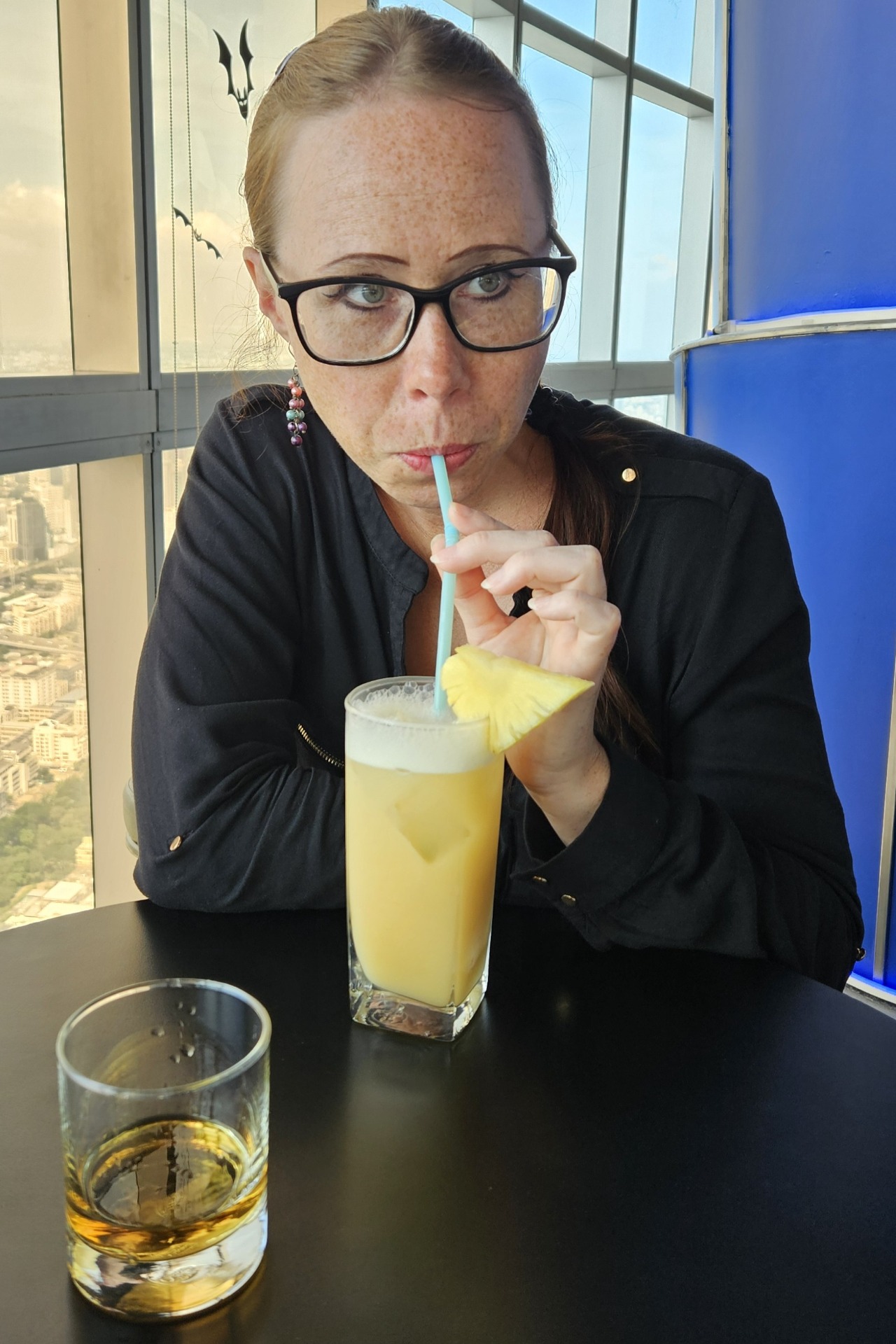 Součástí vstupného za 450 THB byl také nápoj zdarma, v baru o patro níž jsme si mohli vybrat, jaký přesně. Marek si dal whisky a já piňa coladu.