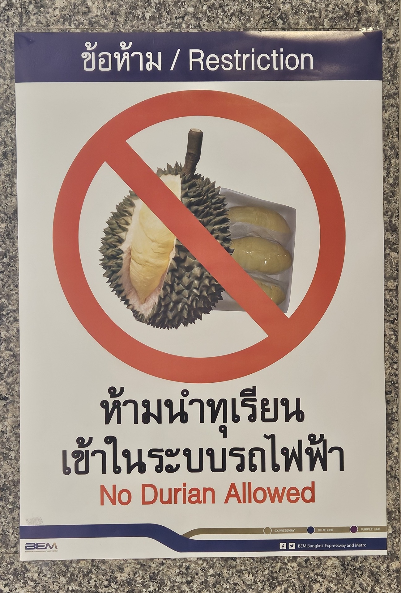 V nižších patrech Terminalu 21 jsme ještě dokoupili poslední suvenýry pro přátele a rodinu, sbalili kufry a pěkně nadité je dostrkali ke vstupu do metra. Obligátní cedule hlásala přísný zákaz převážení durianů.