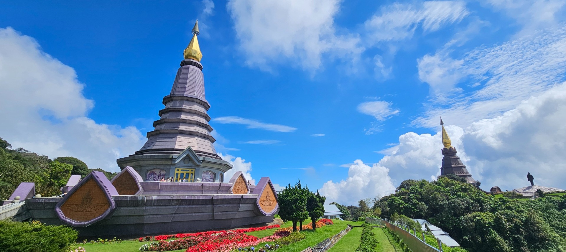 O 5 kilometrů dále a 400 výškových metrů níže stojí podstatně viditelnější a reprezentativnější vrcholky, ne však hor, nýbrž dvou pagod.