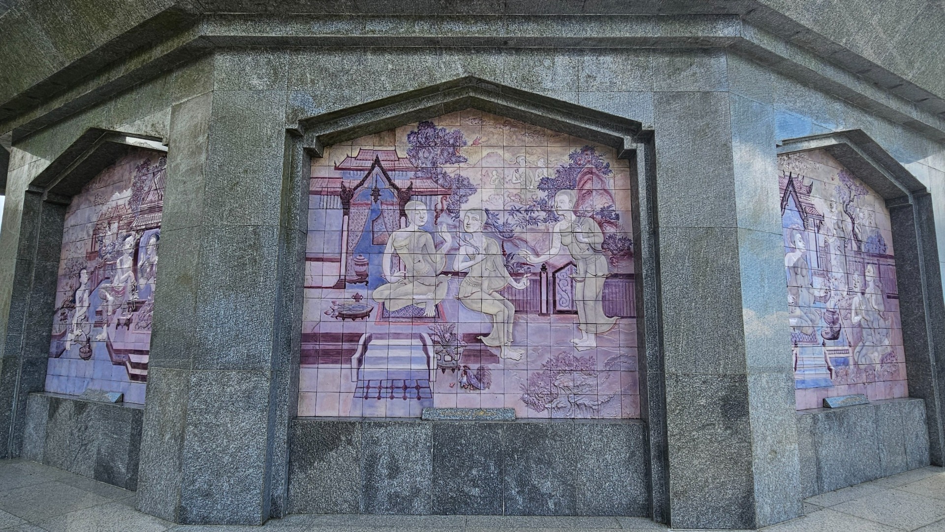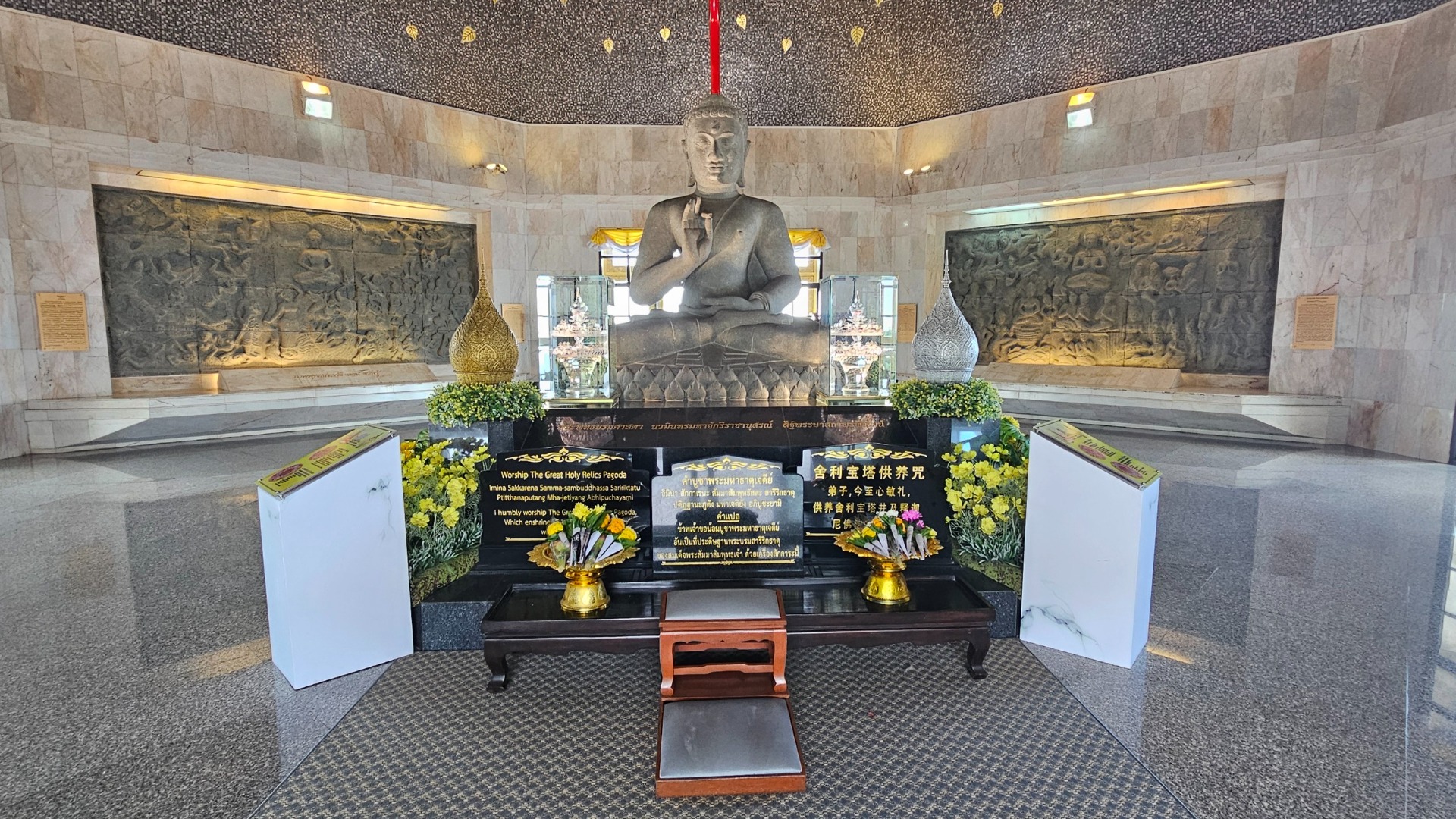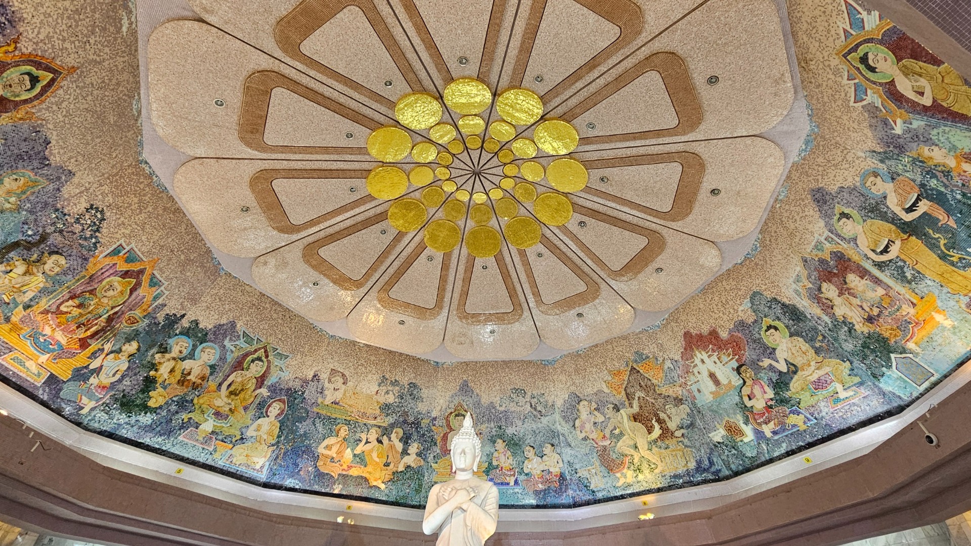 …zatímco mozaiky uvnitř vyprávějí o Buddhově životě.