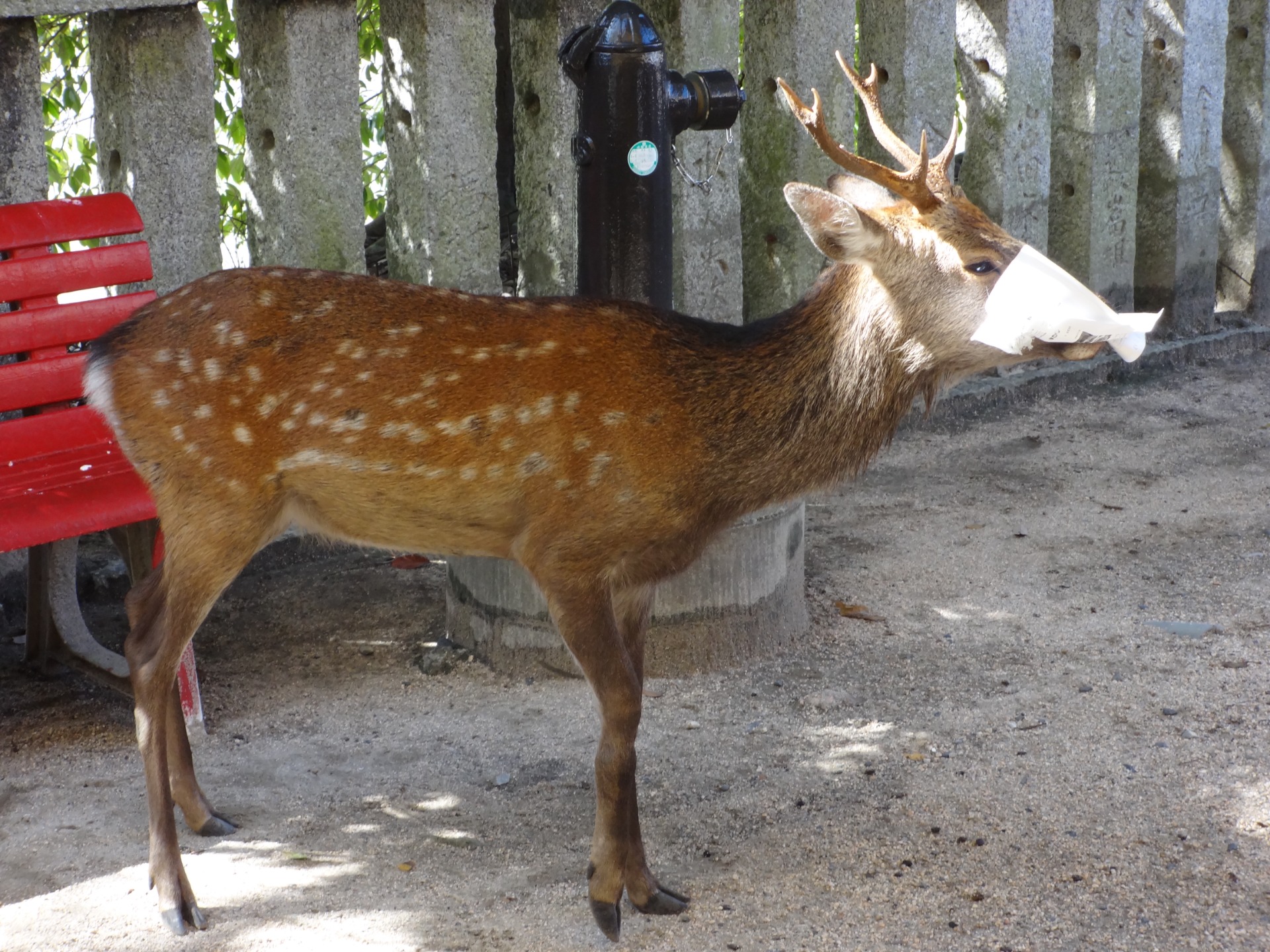 Jeleni sika jsou považováni za posvátná zvířata a posly šintoistických bohů, nikdo jim na ostrově nesmí ublížit! Jeleni tak zcela beztrestně prochází mezi davy návštěvníků, především dole na pobřeží, a strkají čumáky do tašek, což jim ale každý rád odpustí.