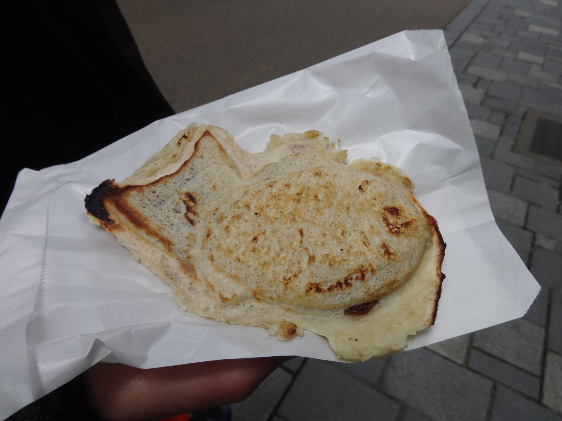 Cestou dolů z chrámové hory přišel vhod maličký stánek u cesty, ve kterém paní prodávala taiyaki – tradiční sladkou pochutinu ve tvaru rybičky. Těsto chutná podobně jako naše palačinky a nejčastější náplní je pasta z červených fazolí.