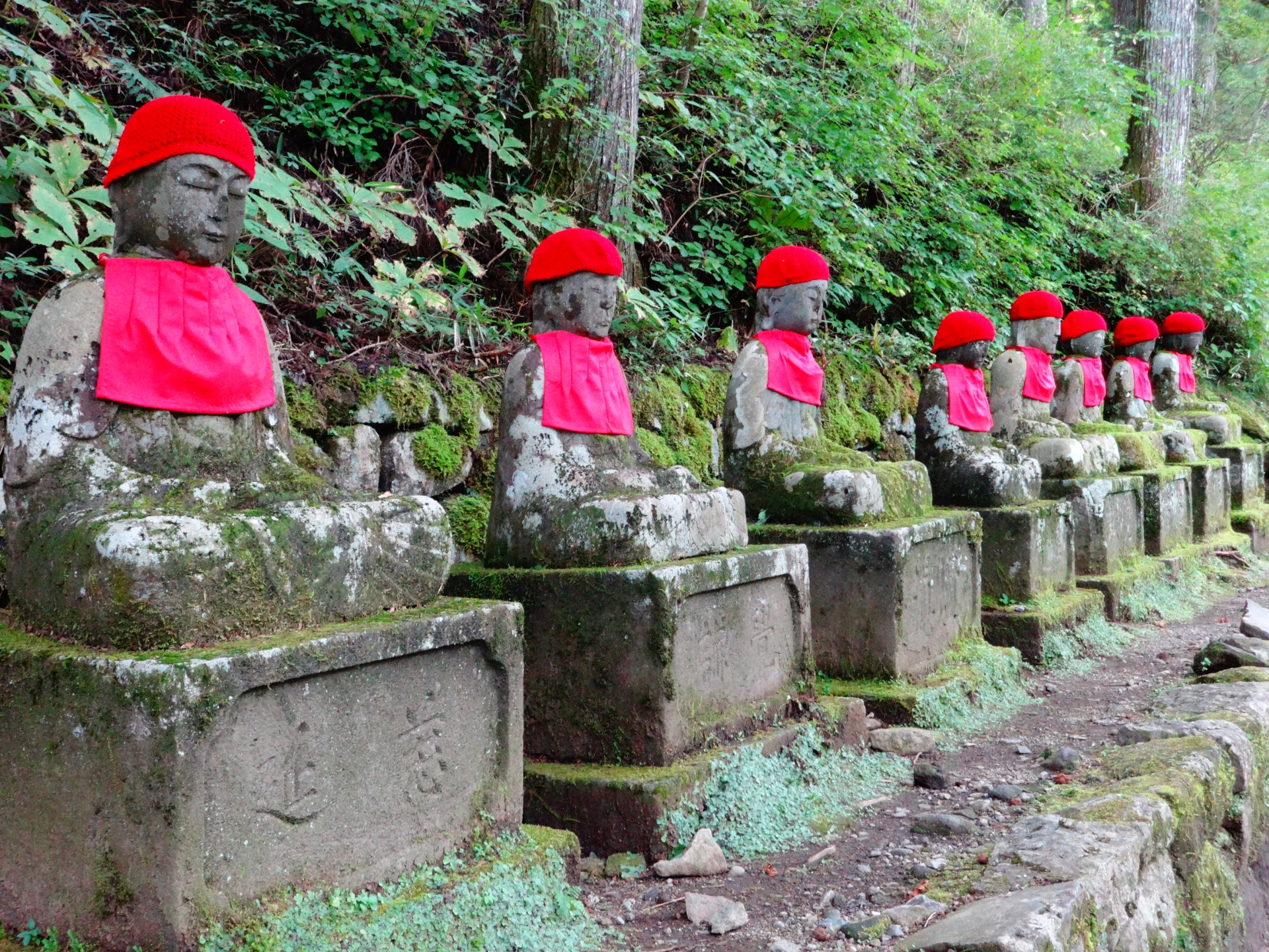 Kousek dál od mostu Shinkyo stojí podél řeky tajemné sochy Jizo.