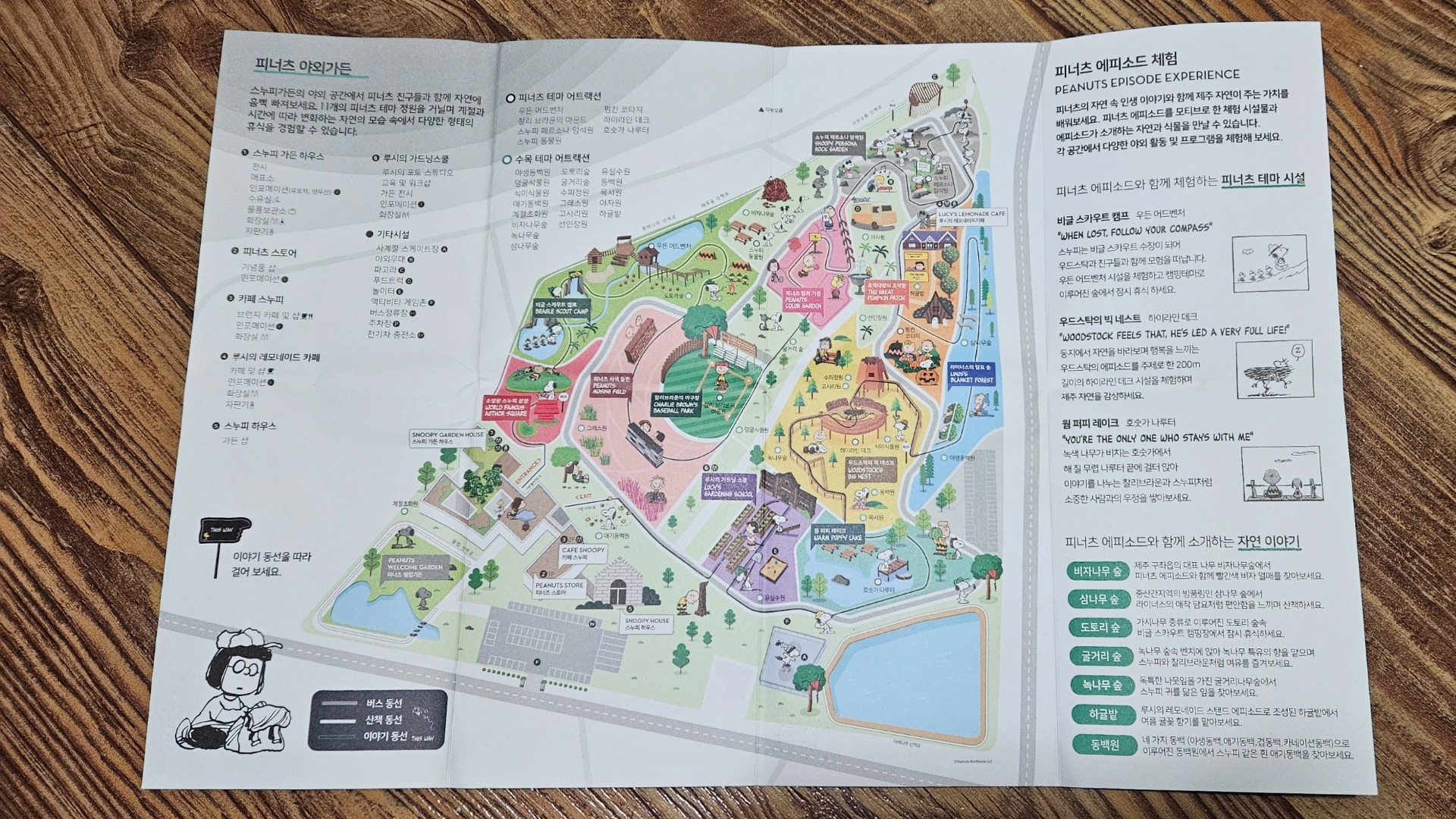 Snoopy Garden je rozdělena na dvě části, vnitřní a venkovní. Vnitřní má spíše naučný charakter, venkovní splňuje korejské nároky na tematické fotokoutky.