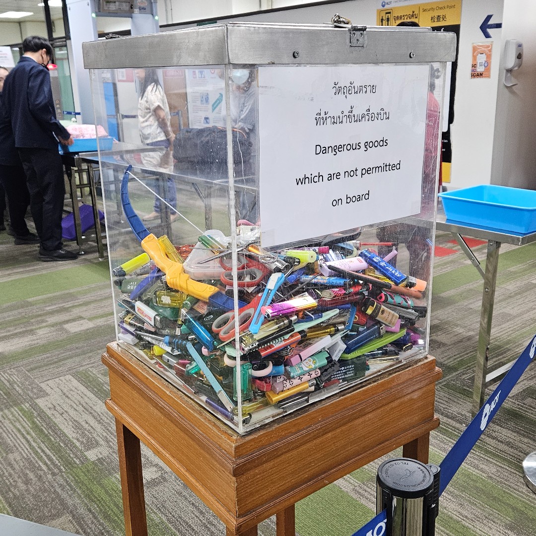 Nízkému počtu leteckých linek odpovídá rychlejší odbavení, všechno tady probíhá plynule a bez problémů. Během bezpečnostní kontroly nás akorát pobavila schránka s vystavenými zabavenými předměty. Věděli jste, že kupř. i plastový dětský luk je nebezpečnou zbraní?